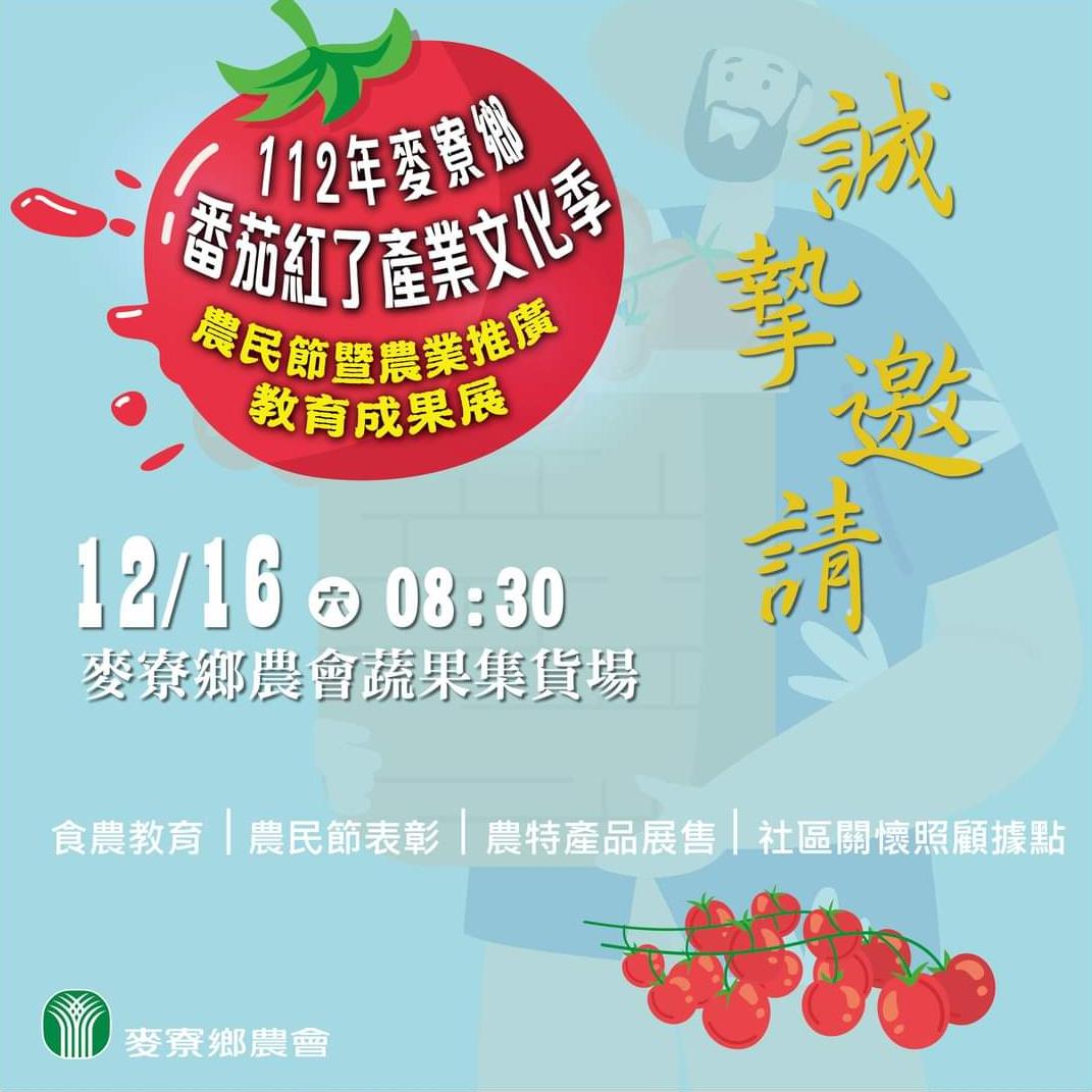 2023.12.16 | 11:53 AM 瀏覽次數 | 5272作者 | 回鄉米----------------------------------------麥寮鄉農會謹訂於112年12月16日(星期六)早上8:30 至12:30,假麥寮鄉農會蔬果集運場舉辦「麥寮鄉番茄紅了產業文化季活動-農民節暨農業推廣教育成果展」。 -