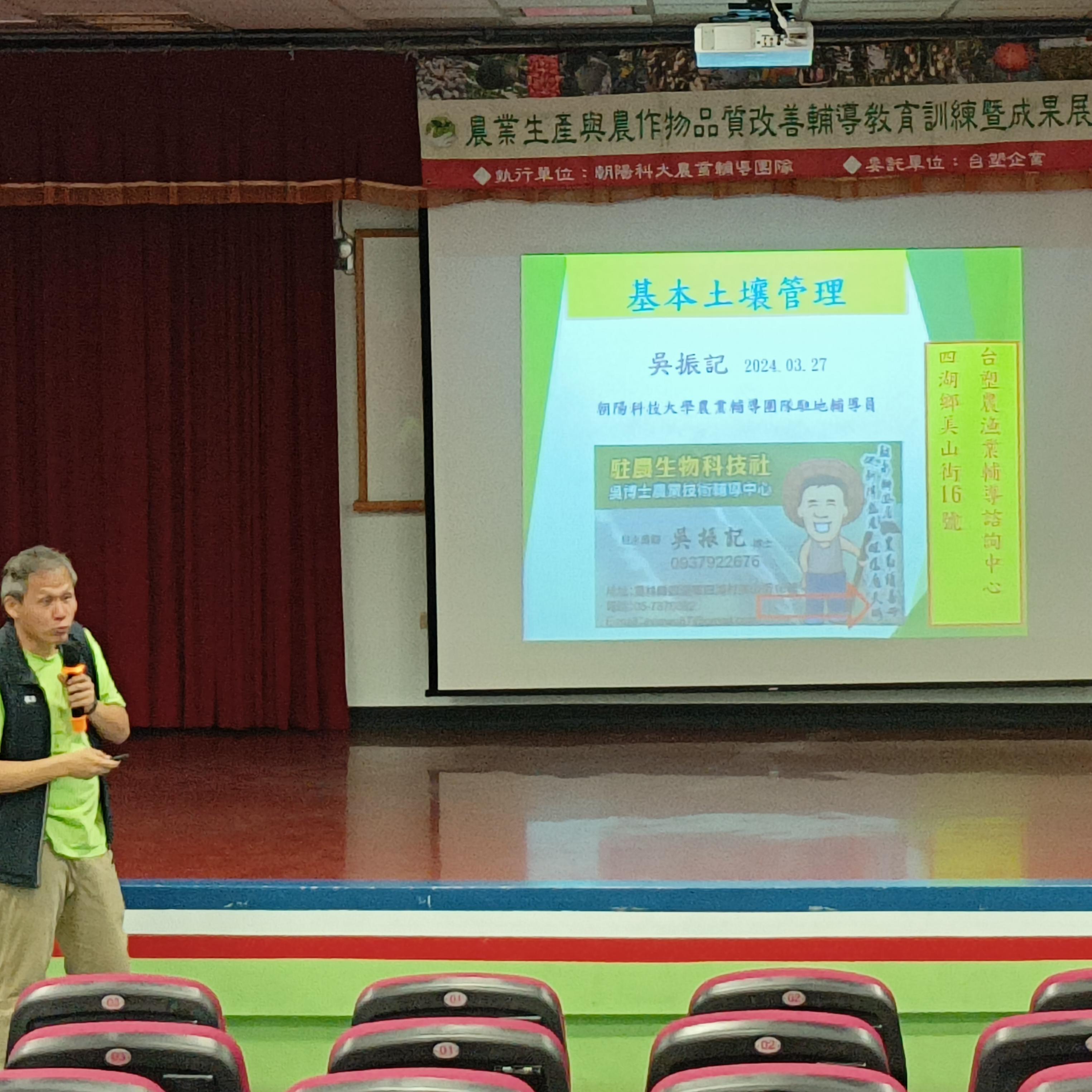 2024.03.28 | 10:57 AM 瀏覽次數 | 5224作者 | 回鄉米----------------------------------------台塑企業與朝陽科大農業輔導團隊為提升農民耕種土壤環境,於113年3月27日上午在麥寮鄉農會辦理「土壤基礎管理及常見病蟲害防治」課程,能有效解決其栽種過程中所遇到之困難,更進一步提升土壤整體環境及品質。 -