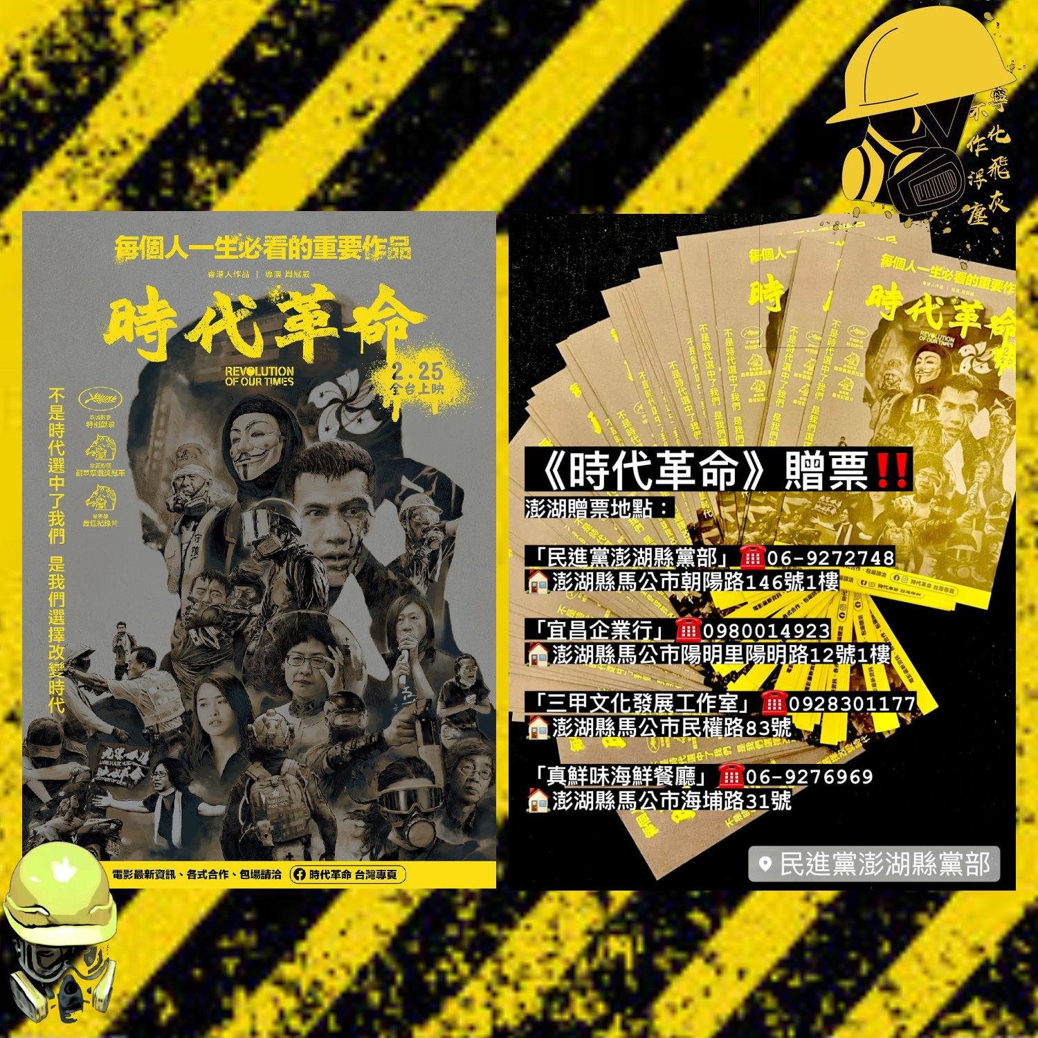 2022.03.03 | 21:40 PM 瀏覽次數 | 34596作者 | TZ----------------------------------------《時代革命》這部電影不應該受壓迫、被消失、被禁言,就像這一代的香港人不應該承受這樣的苦悲,在這樣的時刻,台灣的民間社會再度發揮力量,自發性的認購贈票,希望 #有拿的人一定要去看,而澎湖也將在3月4日中 -