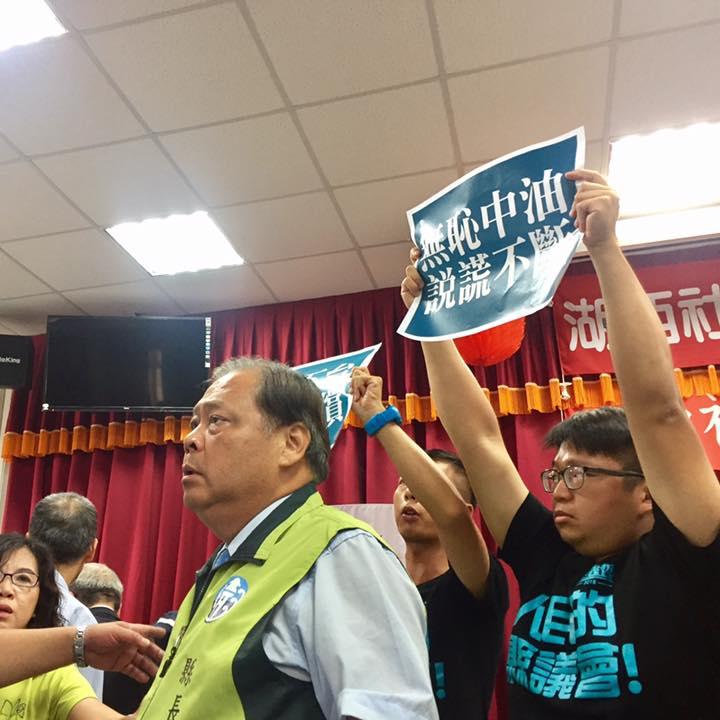 漏油事件再開說明會 西溪青年賴立凱高舉摻油水瓶要求中油董座戴...