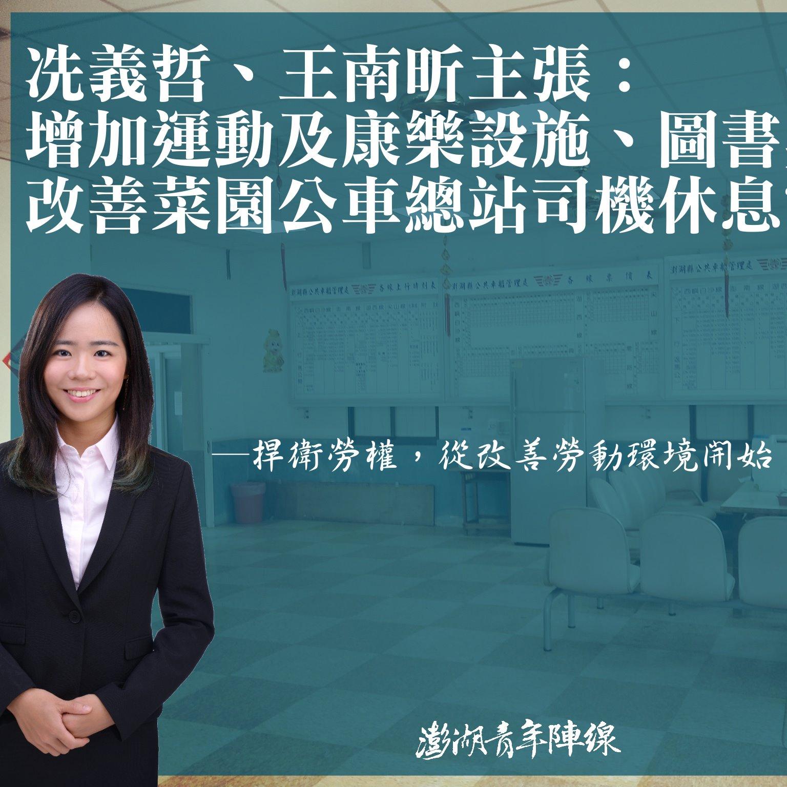 2018.06.12 | 17:24 PM 瀏覽次數 | 8964作者 | 陳家澎----------------------------------------11日上午,澎湖縣議員參選人冼義哲公開發文,承諾當選後將著手改善菜園公車總站司機休息室環境,增加運動及康樂設施、圖書收藏,強調「捍衛勞權,從改善勞動環境開始」。日前,有公車司機向市代二選區參選人王南昕 -