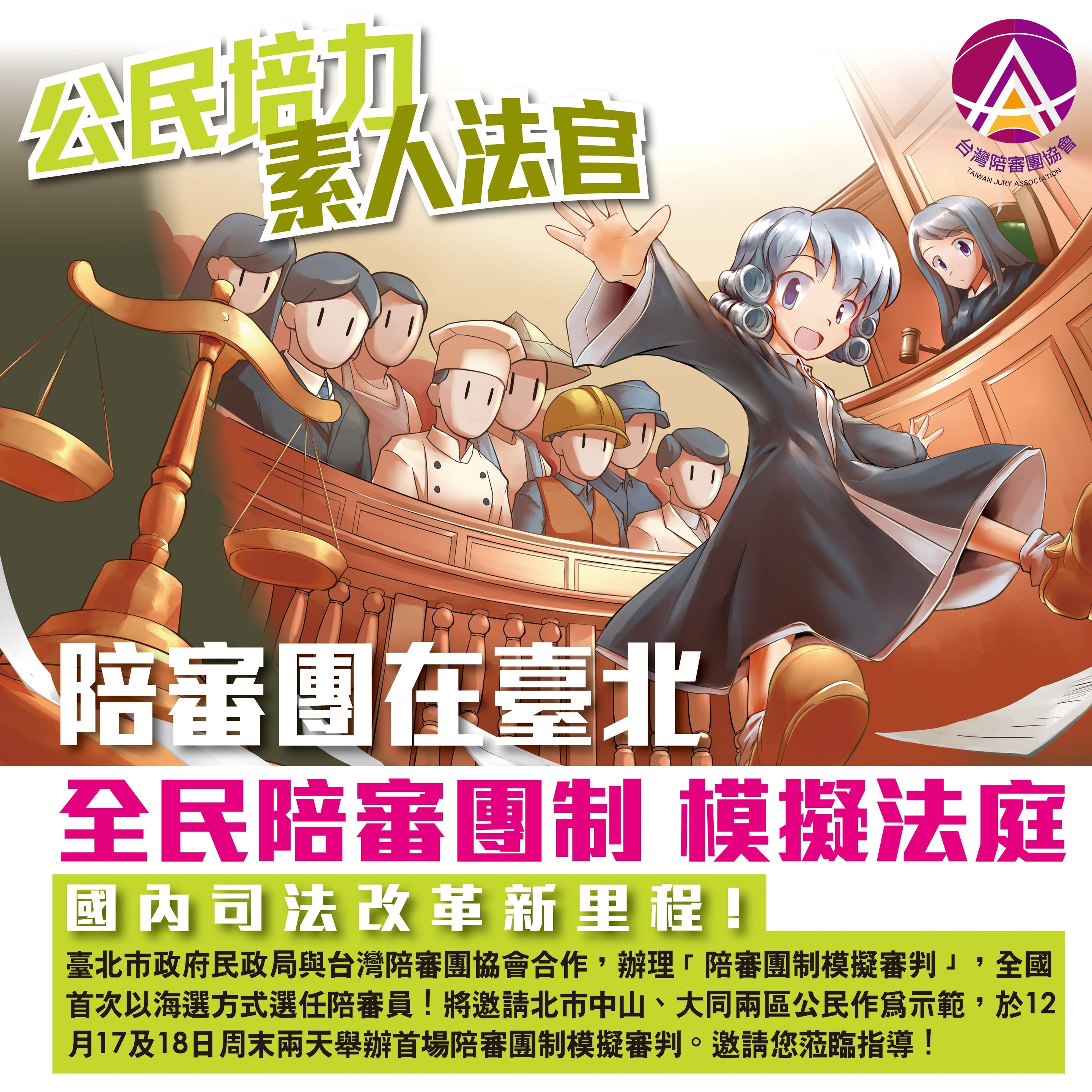 2016.11.29 | 10:30 AM 瀏覽次數 | 7856作者 | 台灣陪審團協會----------------------------------------臺北市政府民政局與台灣陪審團協會合辦之「全民陪審團制」模擬法庭,即日起開始報名旁聽囉!全國首場海選陪審員自人民參與審判制度成為話題以來,民間已舉辦大大...