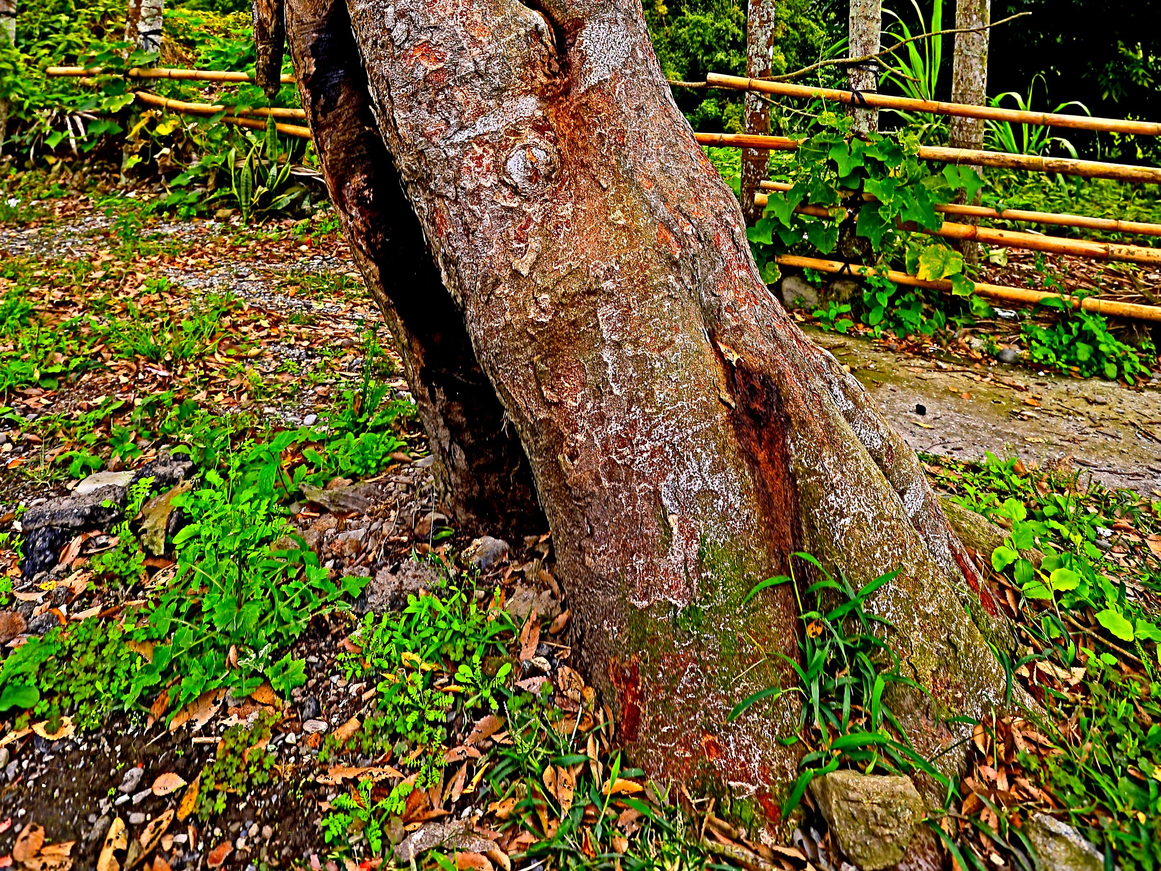 這是台灣櫸的樹幹,紅色樹皮像鱗片。 -