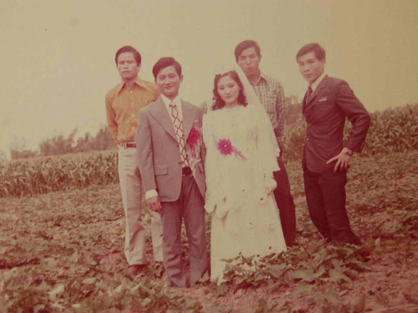 44年前,新郎張田黨(前左一)、新娘鄒宜瑾,在親友陪伴下於蕃藷田拍婚紗照。