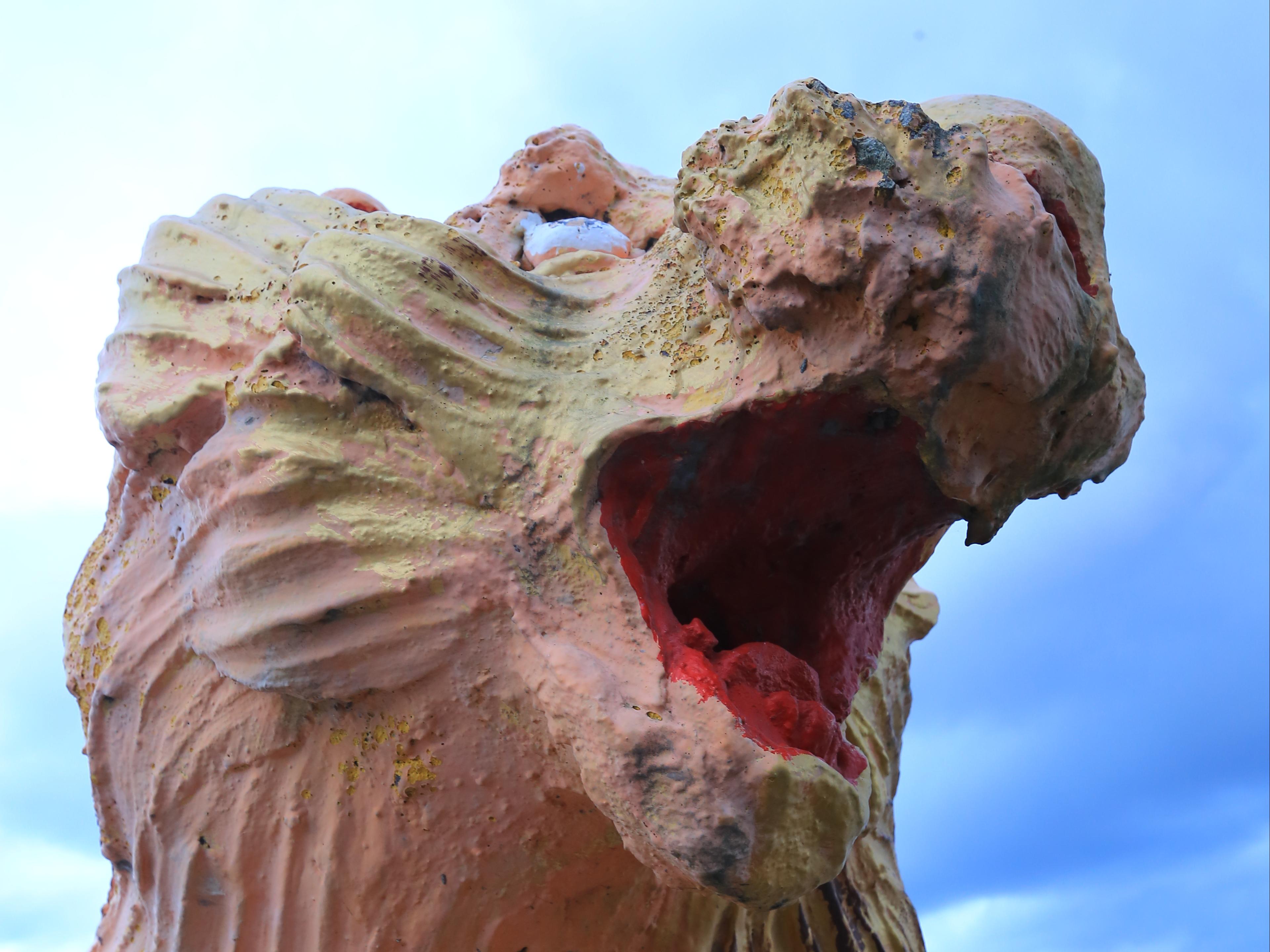伯公廟原來泥獅,面目猙獰,又有血盆大口,十分罕見。 -
