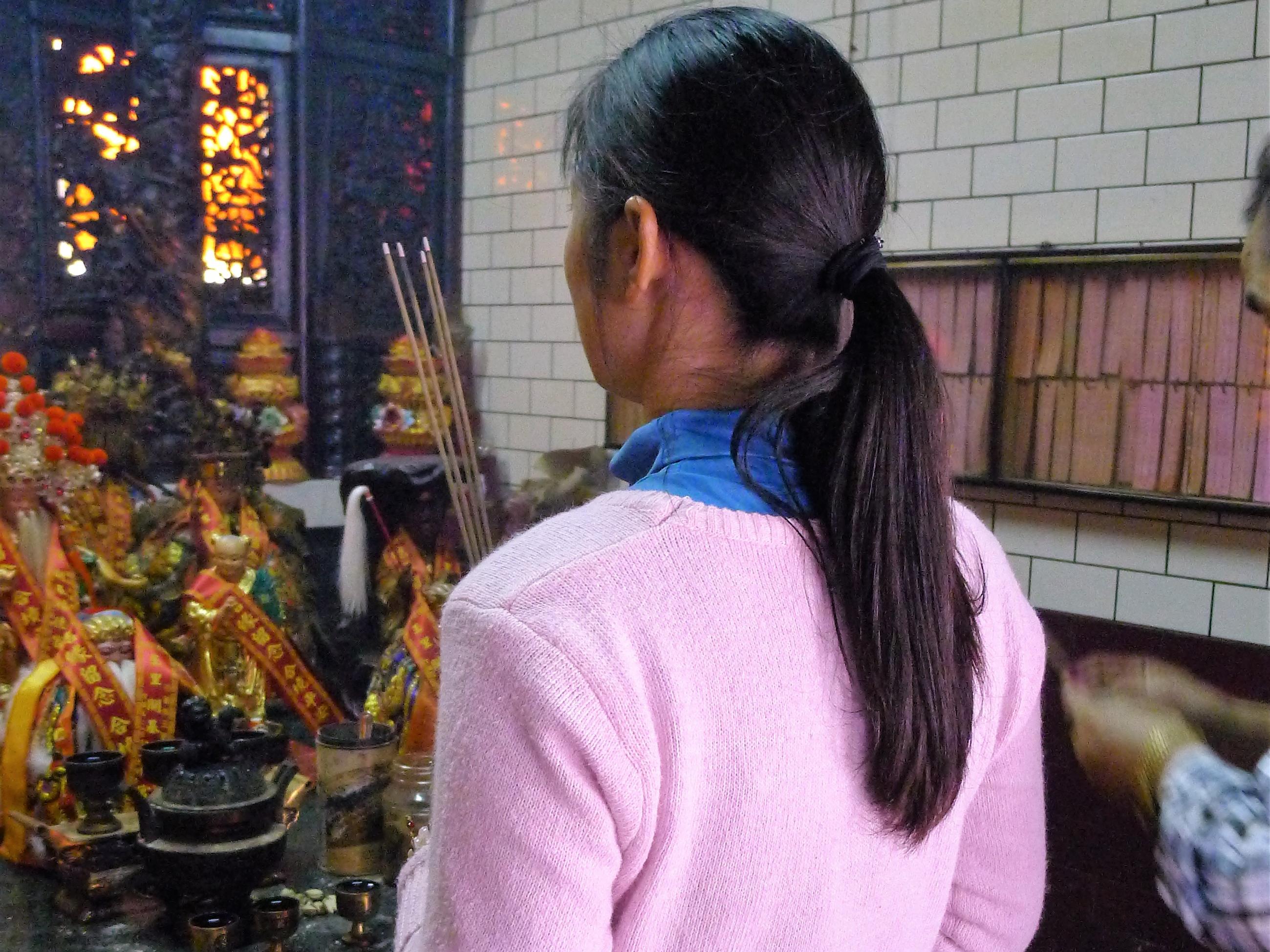 由於她自已年歲也大,對燒香的煙有很高的戒心,對於家中,每天早晚六柱香的燒香拜拜,決心改變,她用擲筊的方式,獲得神明和公媽的諒解,把每天早晚六炷香改為每月初一、十五再燒香。
