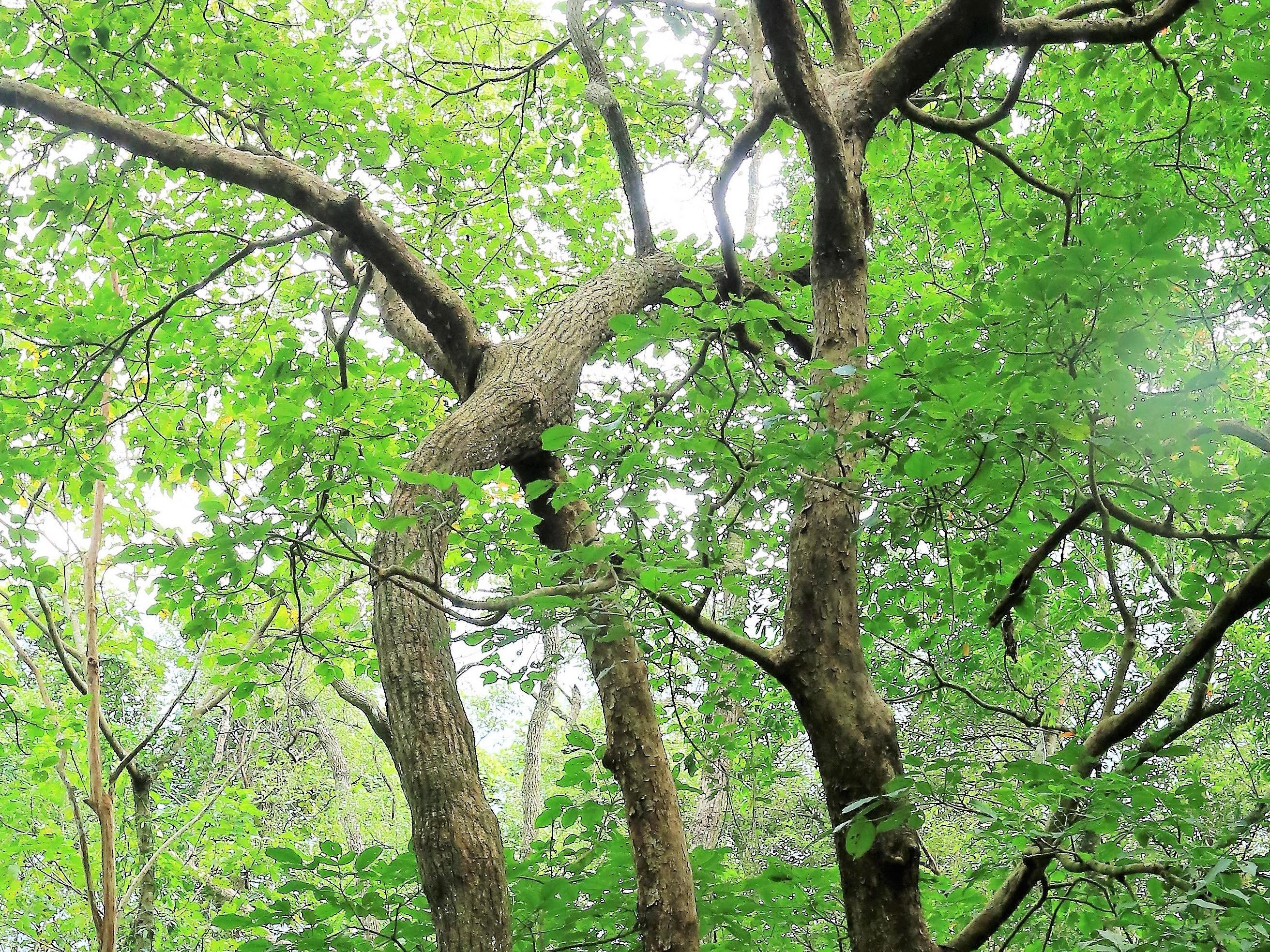 在花蓮林區管理處鹿鳴苗圃附近闊葉林裡,一棵樟樹和隔鄰的茄苳樹比鄰成長,可能是颱風關係,樟樹的一支分枝在半空彎向茄苳樹,和茄苳樹的枝幹碰在一起,像是被高壓電電到,樟樹包住茄苳樹幹分不開,交叉結合,兩樹在半空中合體,也成為森林裡的特殊一景。