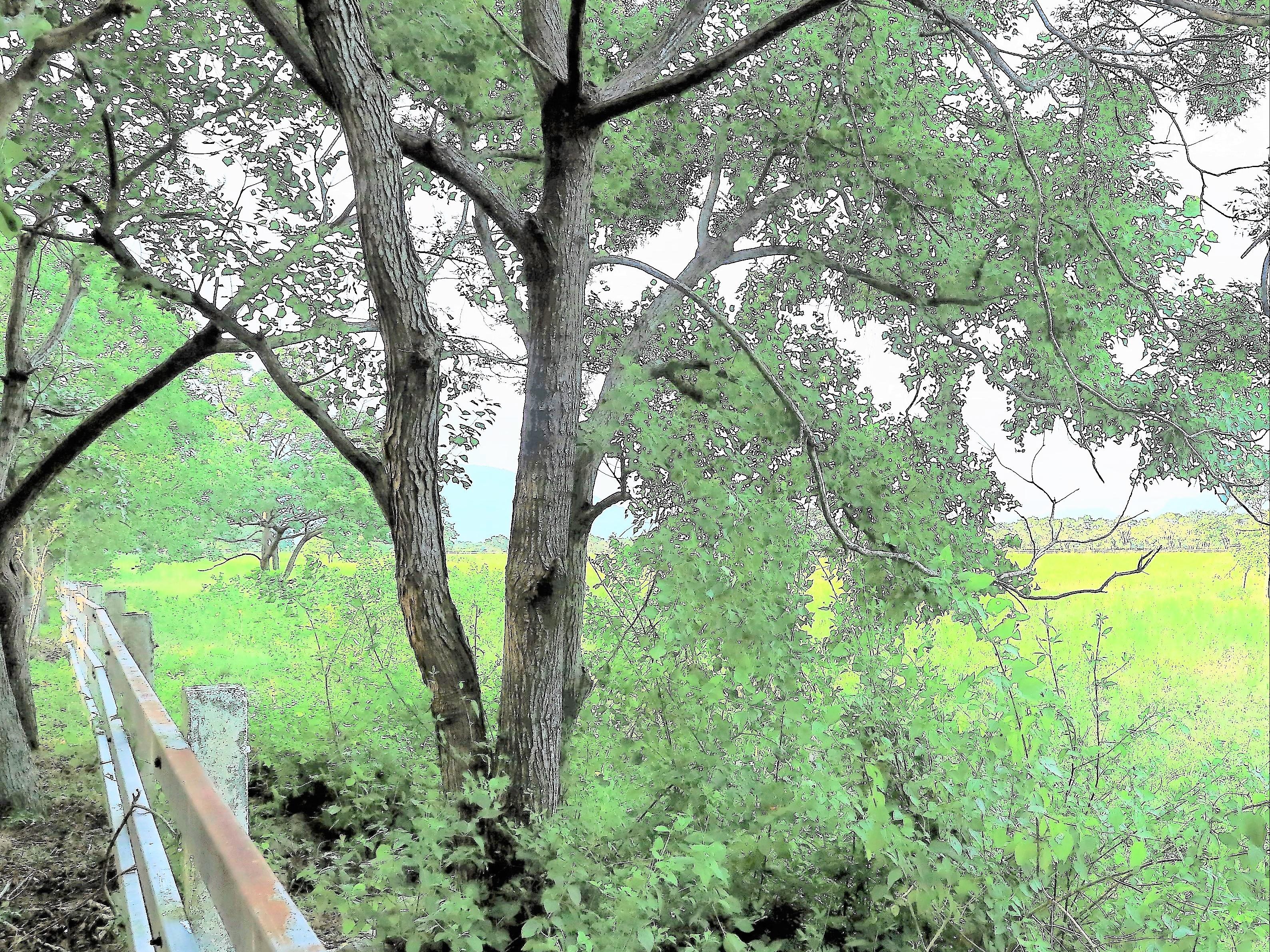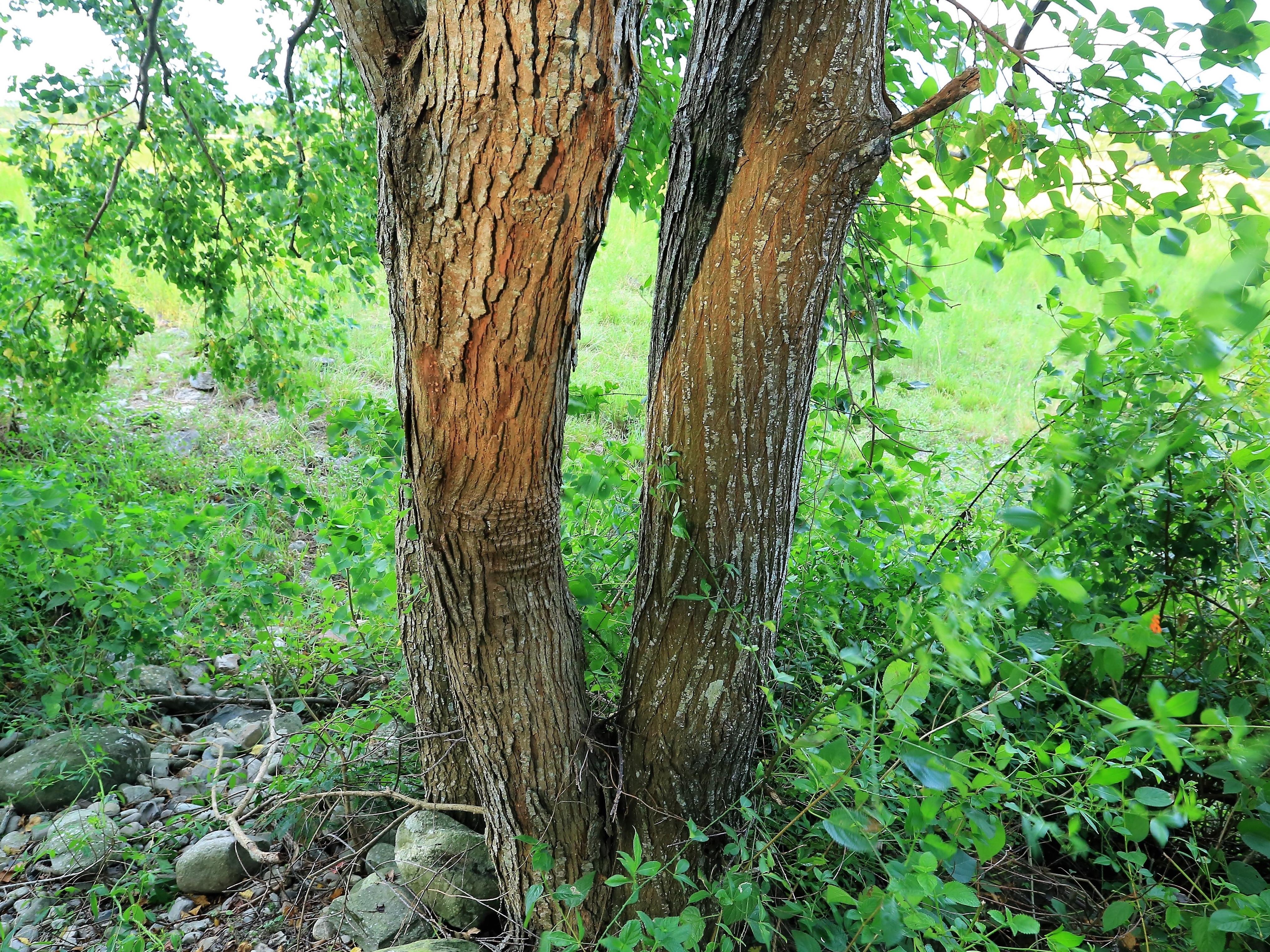 這棵樹在牧牛區內,右邊一株看起來是同一棵的叉枝,其實是一株苦練樹,左邊另一支則是全然不同樹種的烏桕。看樹皮,兩株很像,其實樹皮裂紋和顏色都不一樣。