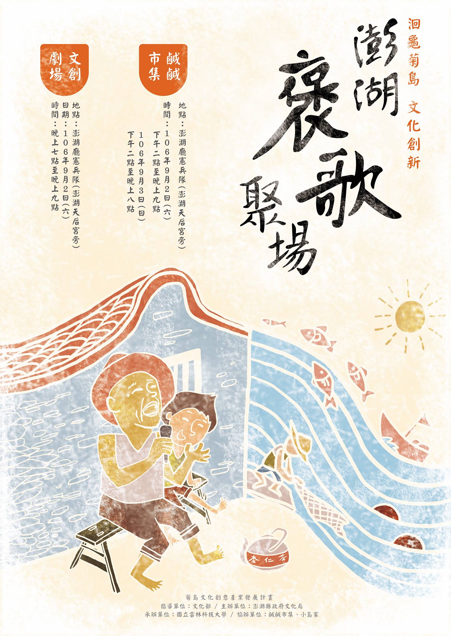 由文化部指導、澎湖縣政府文化局主辦菊島文化創意產業發展計畫-洄龜菊島‧文化創新,國立雲林科技大學承辦「2017 澎湖褒歌傳唱新創徵選活動」,現正進行入圍作品網路票選活動;9月2、3日將由鹹鹹市集、小島家協辦,於澎湖廳憲兵隊(澎湖天后宮旁)舉辦「澎湖褒歌聚場」活動,文創劇場將為「2017澎湖褒歌傳唱新創徵選活動」之得獎團隊提供舞台,帶給鄉親好澎友精采的表演。「澎湖褒歌聚場」時間為9月2日晚上七點至九點,「鹹鹹市集」時間則為9月2日下午兩點至晚上九點、9月3日下午兩點至晚上八點。