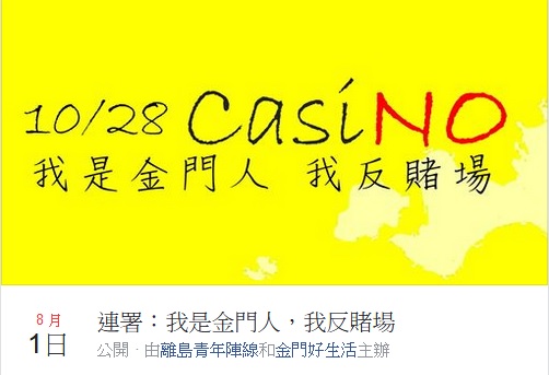 本月初由金門在地粉絲團「金門好生活」及離島青年陣線共同發起【連署:我是金門人我反賭場】網路連署活動,目標在於為三個月後、10月28日即將舉辦金門博弈公投備戰,主辦單位於活動頁中表示:「歡迎所有金門鄉親加入連署,我們將會發送反賭場相關資訊給各位,請大家協力分享、共襄盛舉,一起保衛我們的家園!金門我的家,賭場遠離她!團結守護金門,加入連署串連」!