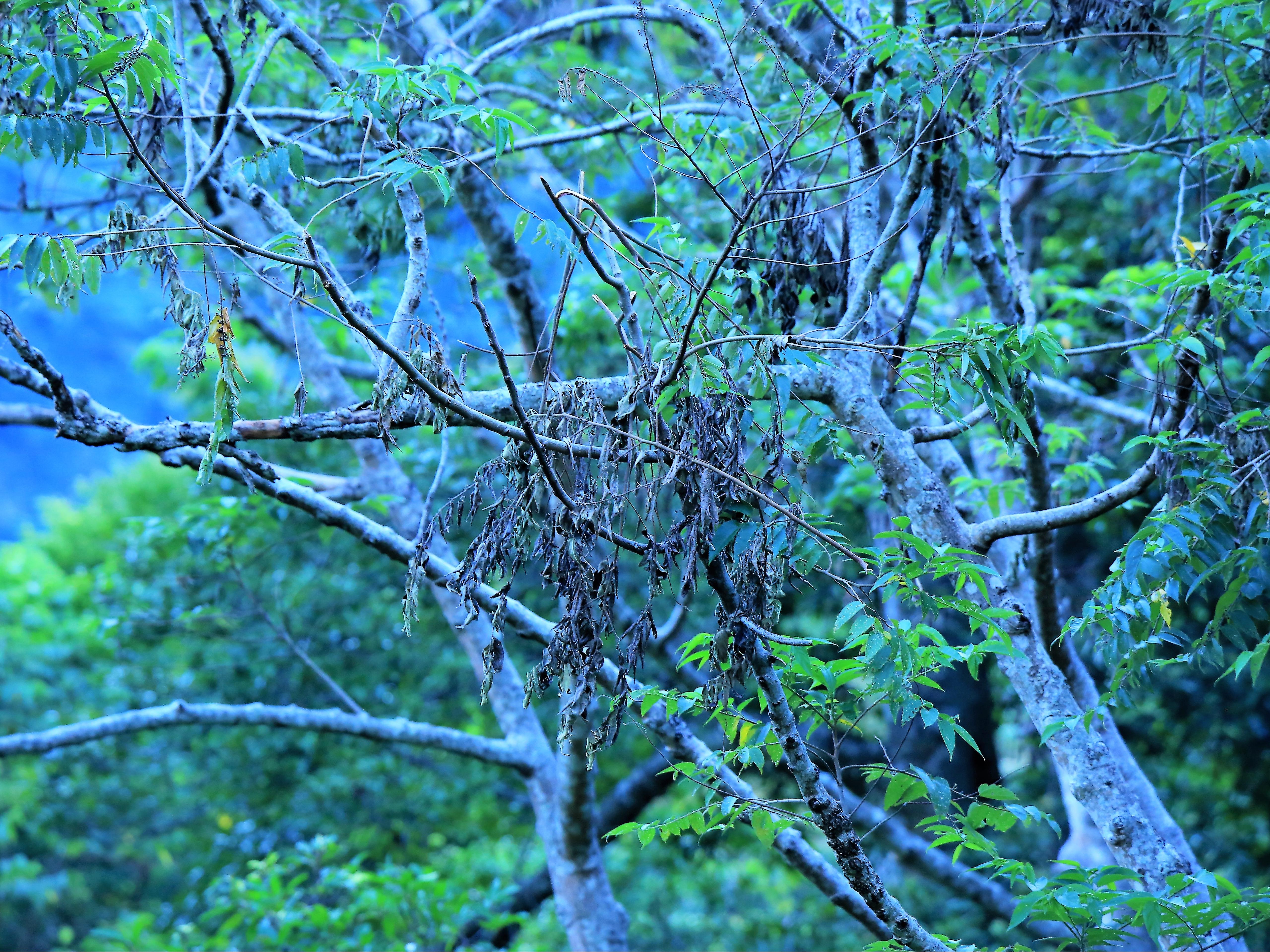 另一個在登山口附近,一株大山黃麻樹上,比較小的虎頭蜂巢也被摘走;同樣的,蜂巢都是築在高空的樹枝上。捕蜂人是怎麽辦到的?只能說高價下必有勇夫。