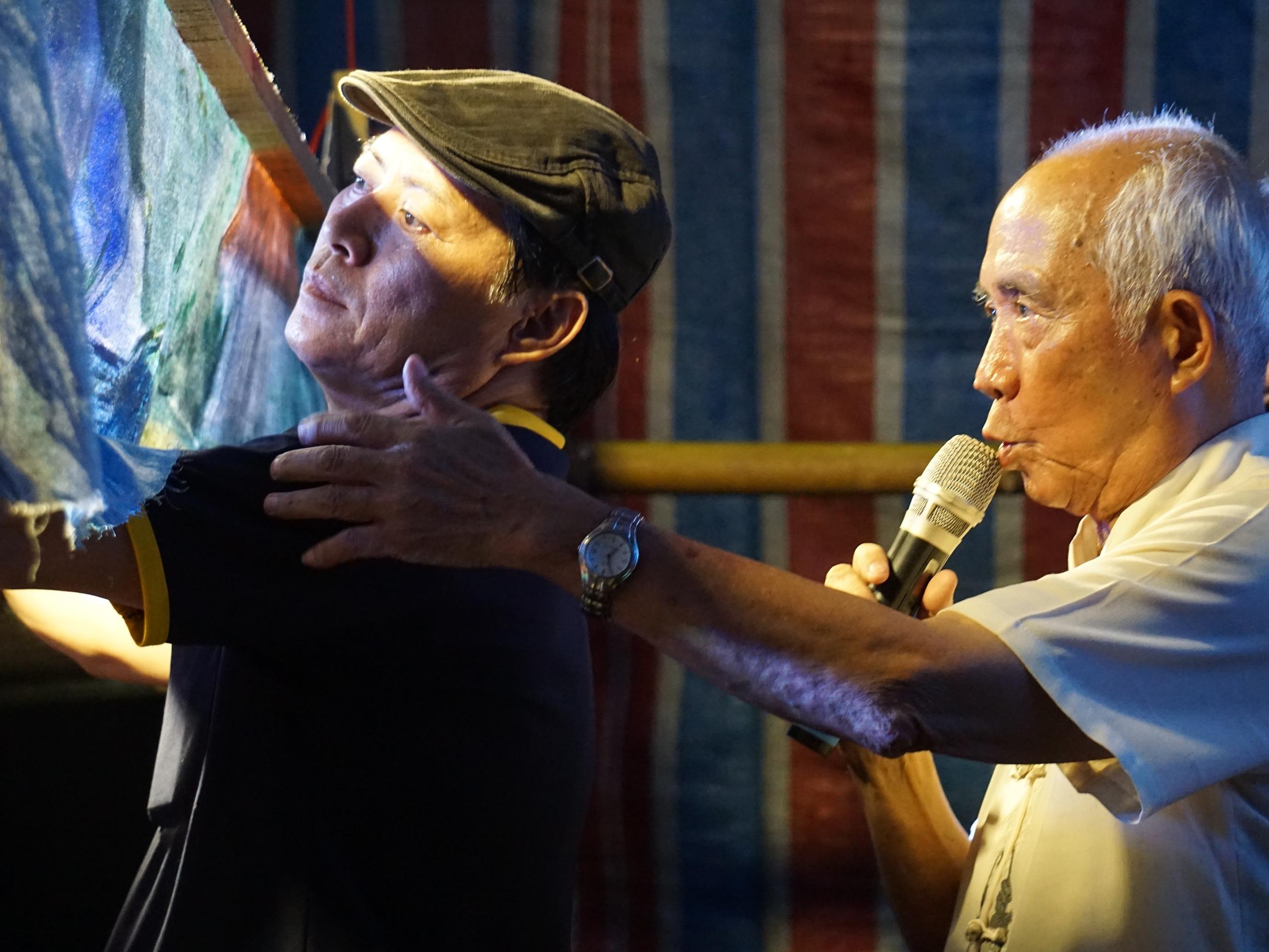 團長蘇俊榮(左一)和父親蘇明順(右一)共同在台上演出《劇團近年重要事蹟》