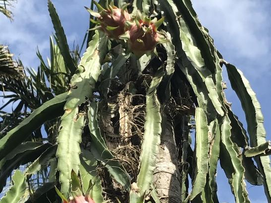 Ben 拍攝/106年9月14日果實累累的火龍果爬檳榔樹而上