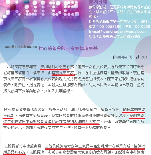 ●偷排業者陳三家政商背景雄厚,縣府認證優鮮業者外更是耕心慈善會創會長