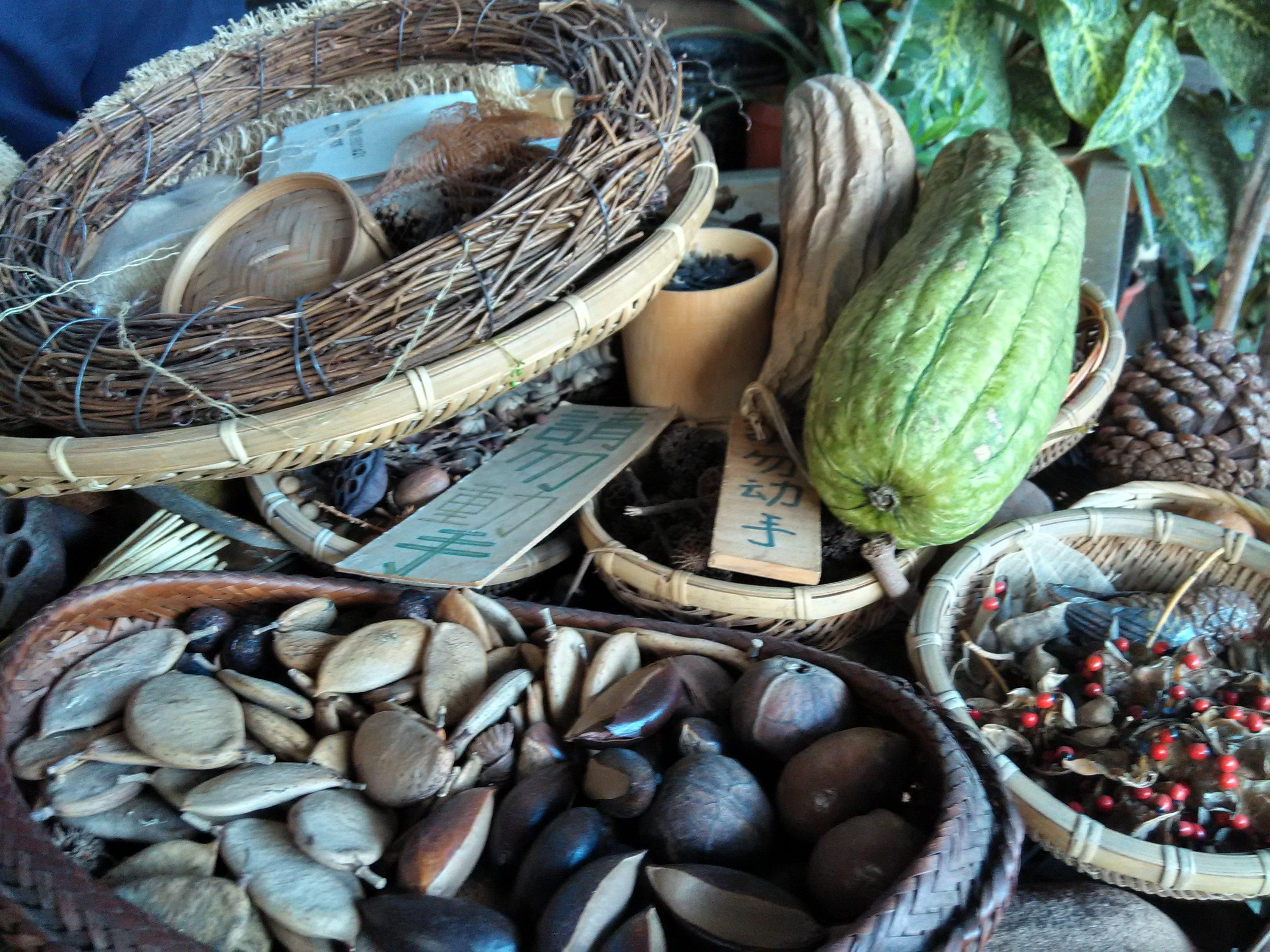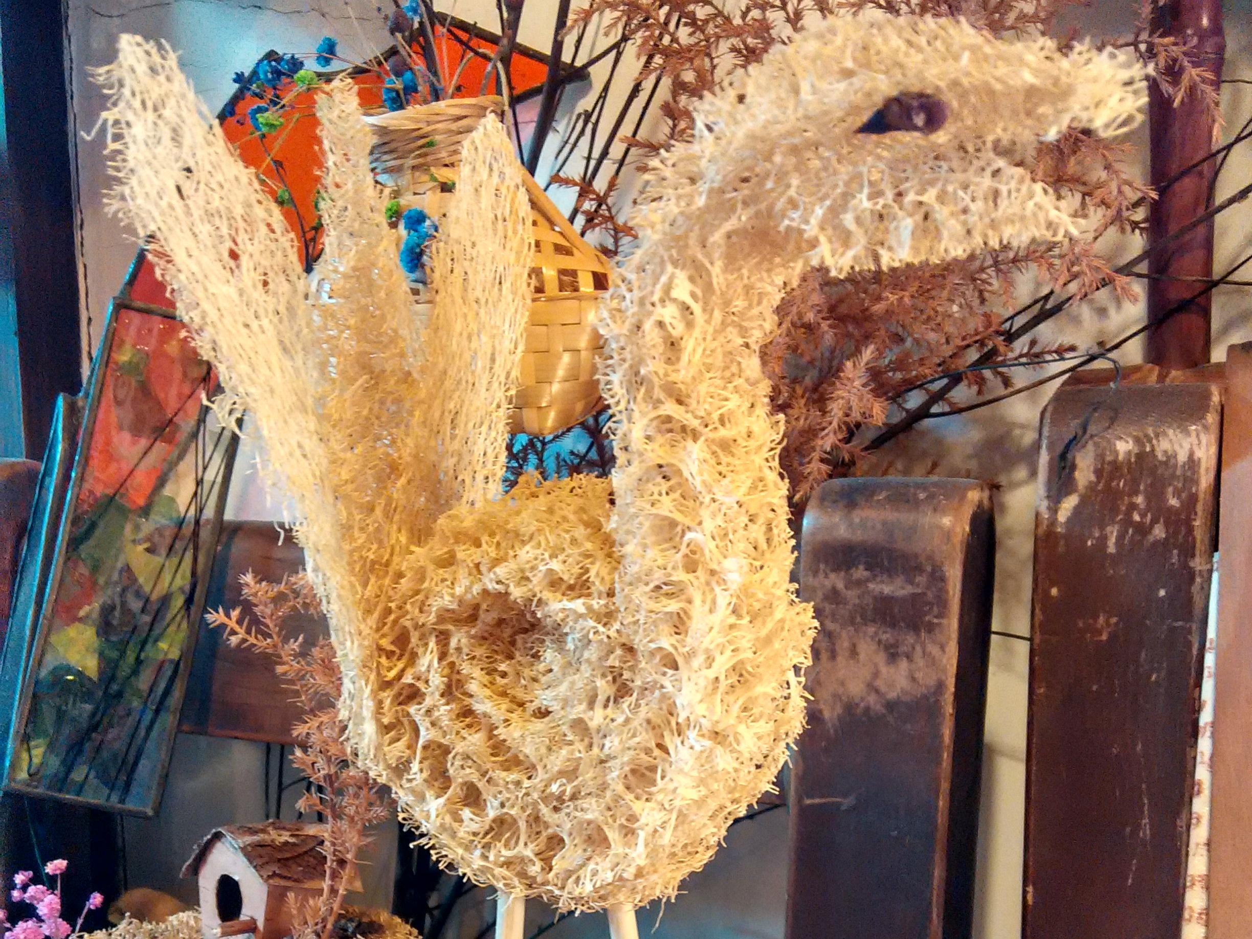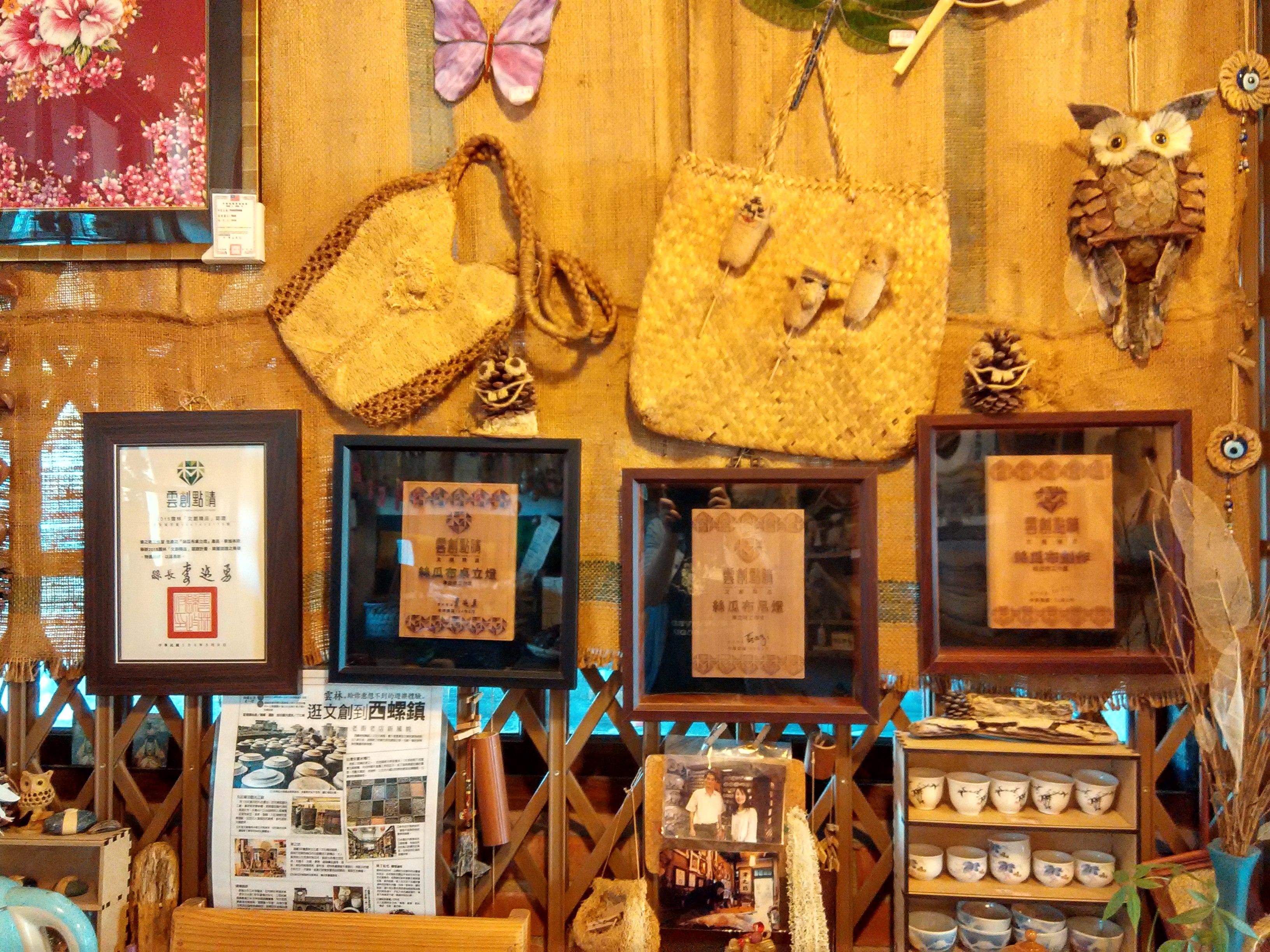 詢及是否有學過藝術的背景,Nancy笑著說:「很多遊客也都會問我以前是不是唸設計,或是有關美學的課程,其實沒有,純粹是興趣。」一條絲瓜布,剛從市場買回來時很硬,她就會開始泡水,軟化之後曬乾才開始剪開製作。一個小的作品至少要經歷三個月才算完成。處理的前置作業比較困難,去殼、剪有時都會傷到手,但她並不在意。從她身上,我們看到興趣會挖掘一個人本身潛在的力量出來。拉開木門,進入眼簾的全是曬乾的絲瓜絡造型,Nancy用絲瓜布媒合稻草、種子、金屬來發想,把自己的創作的主題鎖定在絲瓜絡,讓客人一目了然。「我很喜歡用絲瓜為主,其他的素材為輔,創造出不同的產品,這是我最大的成就,我喜歡去嘗試。」