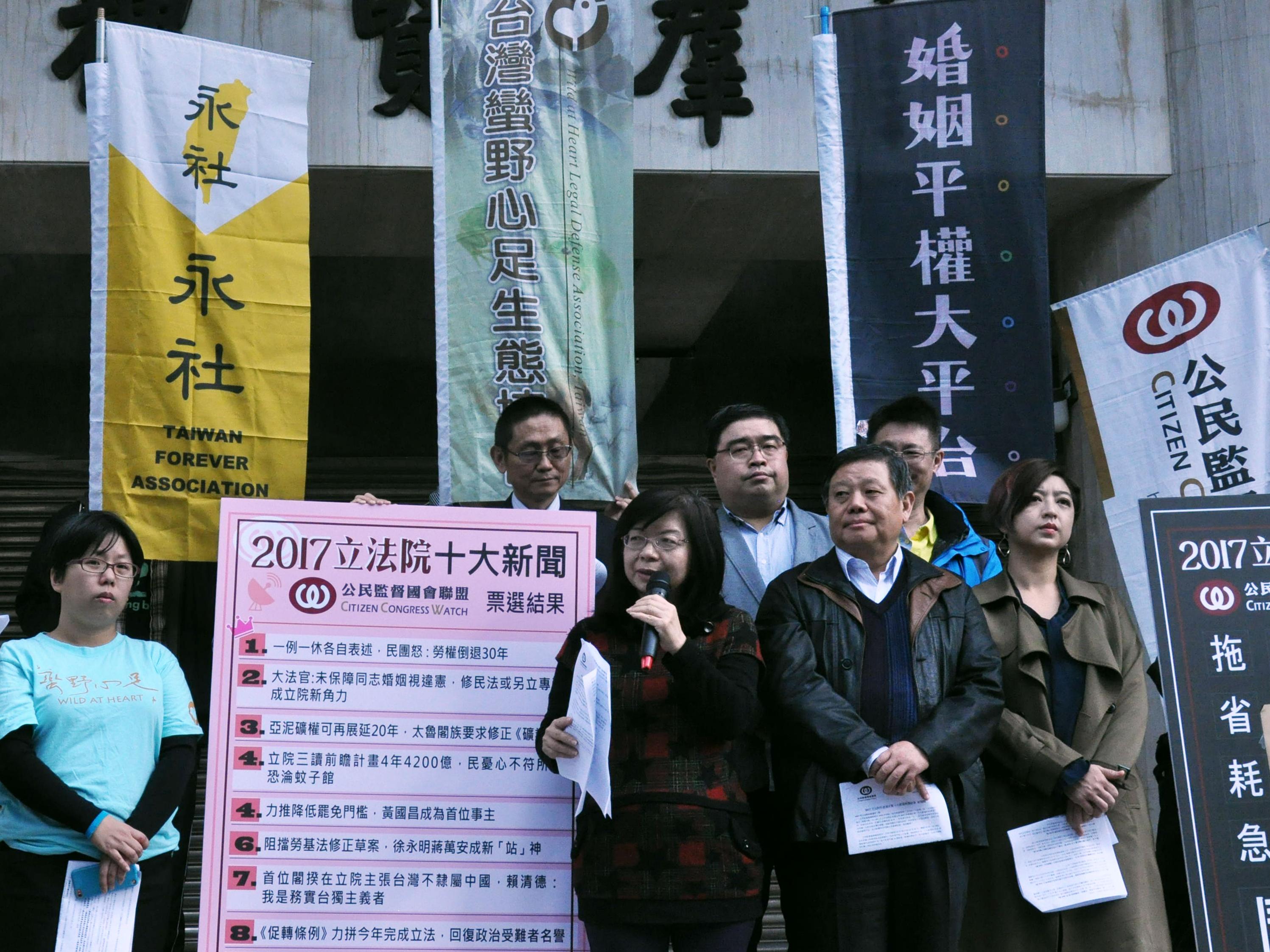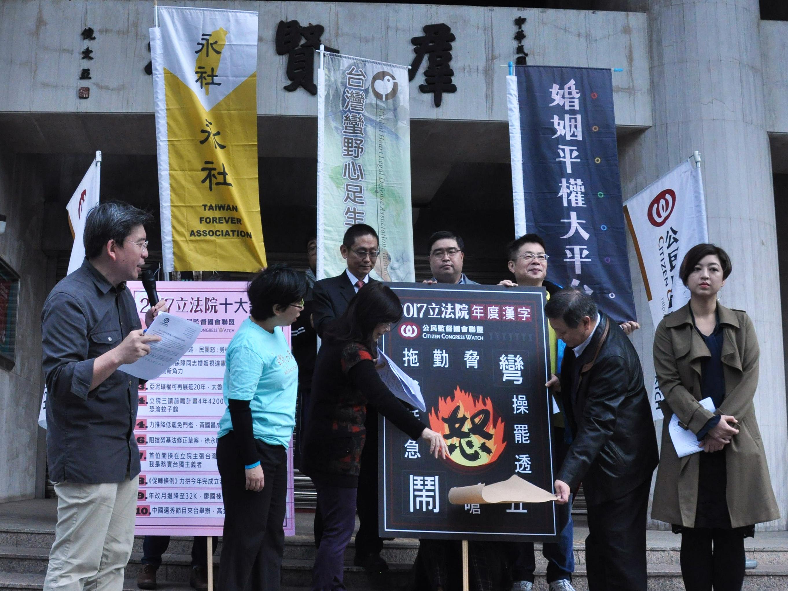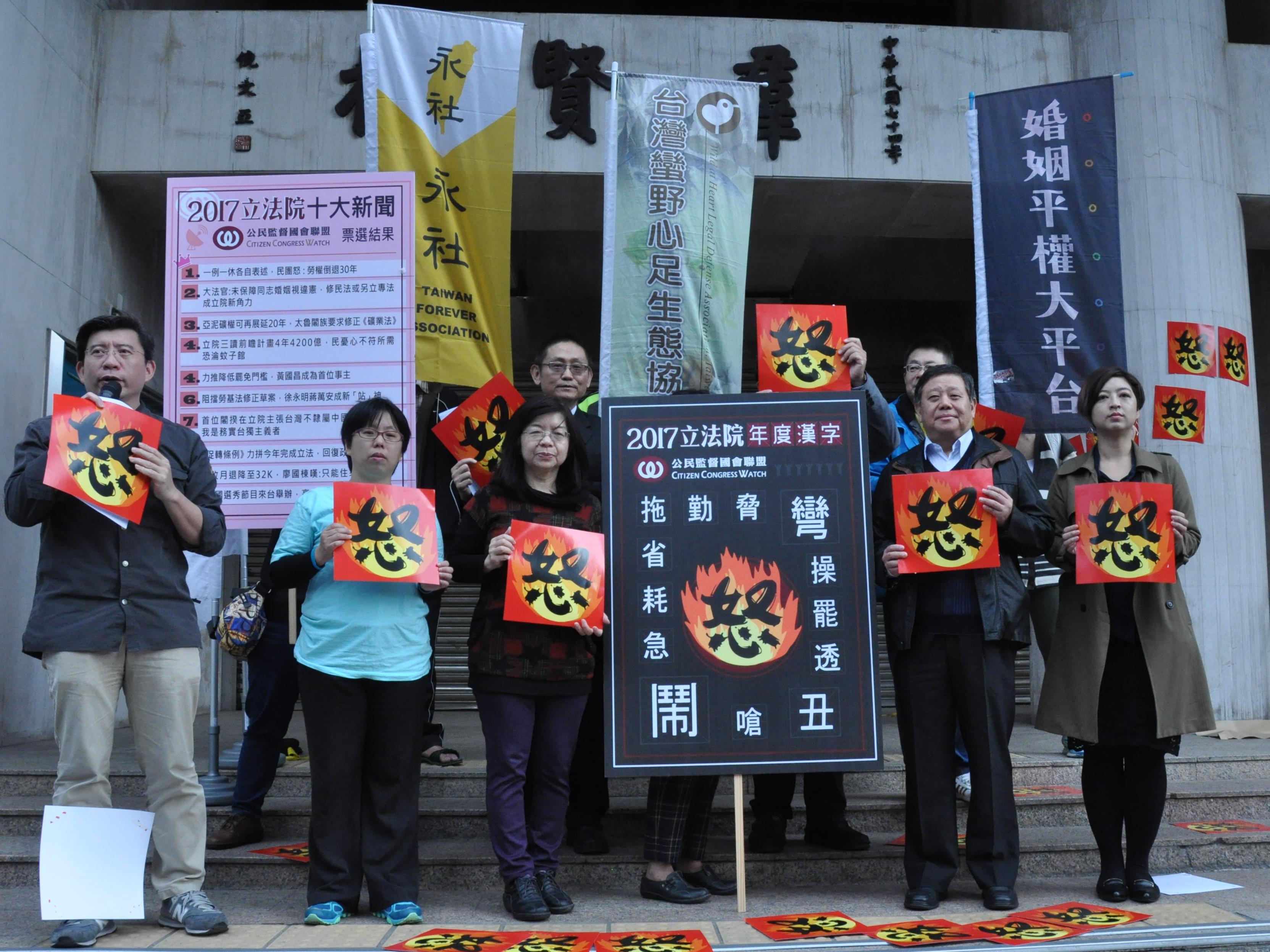 為了更多的民眾關注立法院,公民監督國會聯盟(簡稱公督盟)自2008年開始,每年都會舉辦民眾票選「立法院十大新聞」及「立法院年度漢字」活動。於12月28日於立法院群賢樓召開記者會公布2017年票選結果。今年立法院十大新聞的冠軍是「一例一休修各自表述,民團怒:勞權倒退30年」,國會年度漢字則代表則是「怒」,而這次兩項都與勞基法有關,與會公民團體在呼喊「國會亂糟糟,民眾怒怒怒」的口號後,將各種不同尺寸的「怒」字貼在群賢樓牆上,象徵民眾對立法院這一年的表現是不滿與有怒氣的,也提醒朝野立委應該反省,在所剩的一半任期好好改善,別讓民眾不開心!