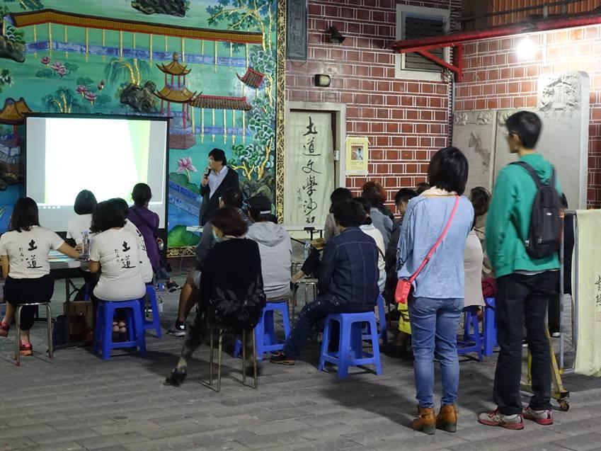 拜亭的大香爐,幾柱清香,嬝嬝餘煙,祈求神明的庇佑,是信眾與神明之間互送信息的媒介。雕琢彩塑,眼觸之地,都有三五○年古廟走過的歲月痕跡。鮮豔彩繪,遍布寺廟角落,在燈光的投射下,五彩繽紛,耀眼奪目。土道公民寫作社精心社策劃的「守護台灣的那一枝筆」,第三場廟口文化沙龍,華麗登場。
