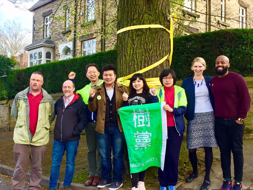 去年春,澎湖縣議員參選人冼義哲以樹黨主席身分帶領台灣代表團參與全球綠黨大會,與Theresa May所領導的保守黨立場相左的英格蘭暨威爾士綠黨締結為姊妹政黨,並率團特別造訪雪埠(Sheffield,另譯為雪菲爾),聲援當時因反對建商炒作土地、濫砍街樹而遭工黨執政當局逮捕的綠黨籍Alison Teal議員。