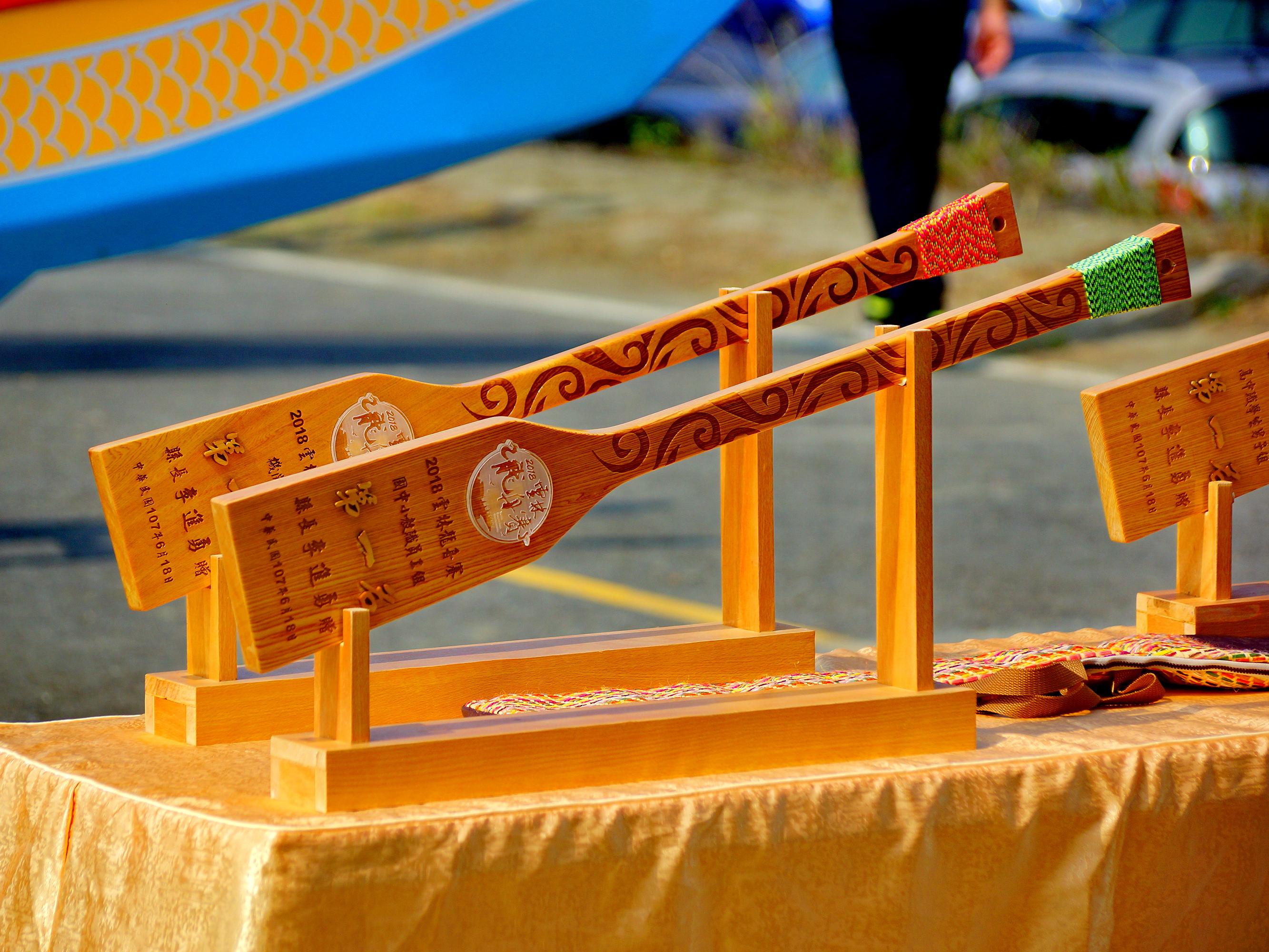 雲林首屆龍舟冠軍獎盃更是吸睛.為完美呈現雲林第一次龍舟競賽.特別以【槳】為【槳】盃採純手工原木打造.【槳】盃上還纏繞這祈福彩線..希望為得獎隊伍帶來幸福平安快樂.讓得獎者留下難忘回憶。