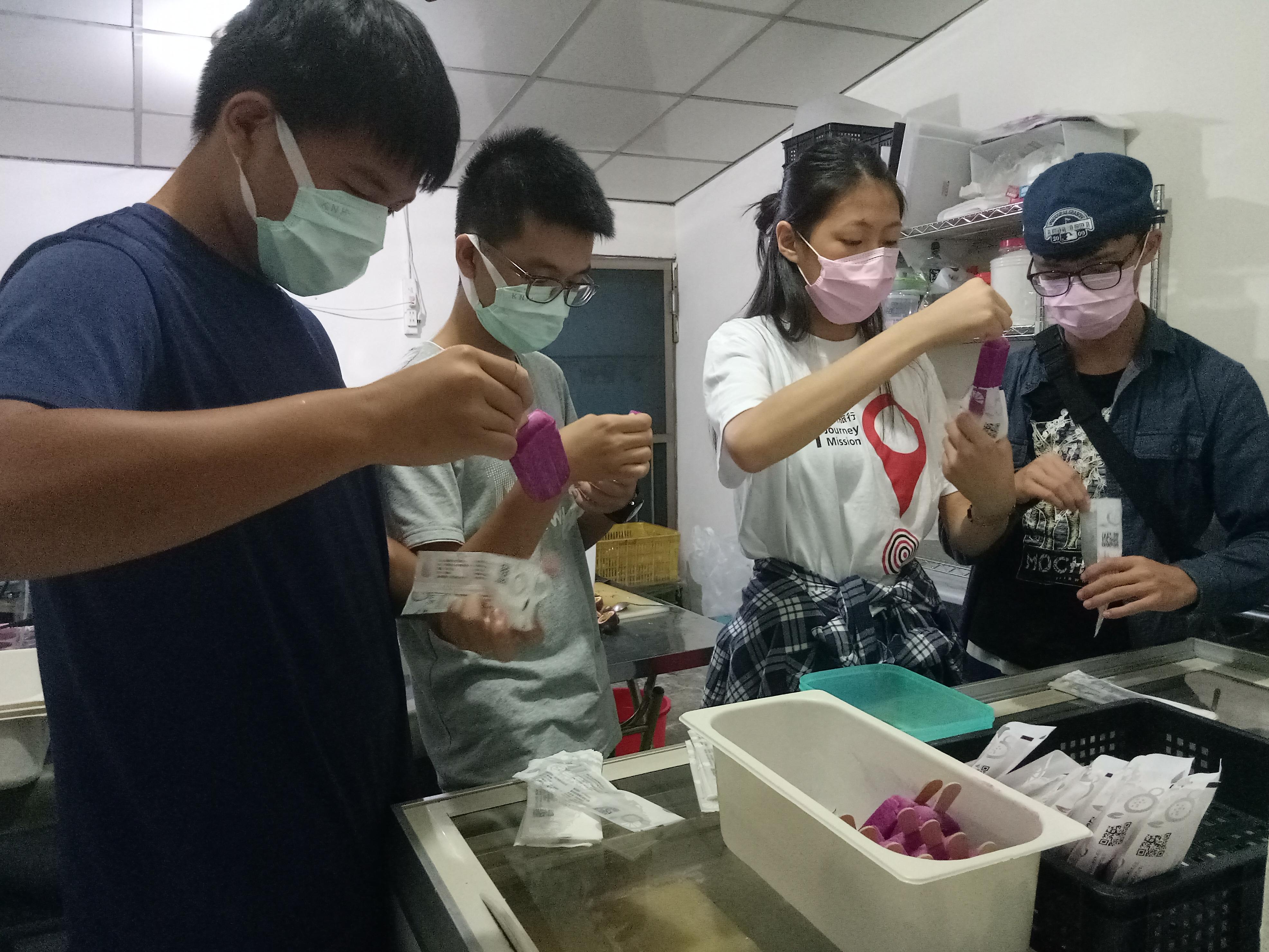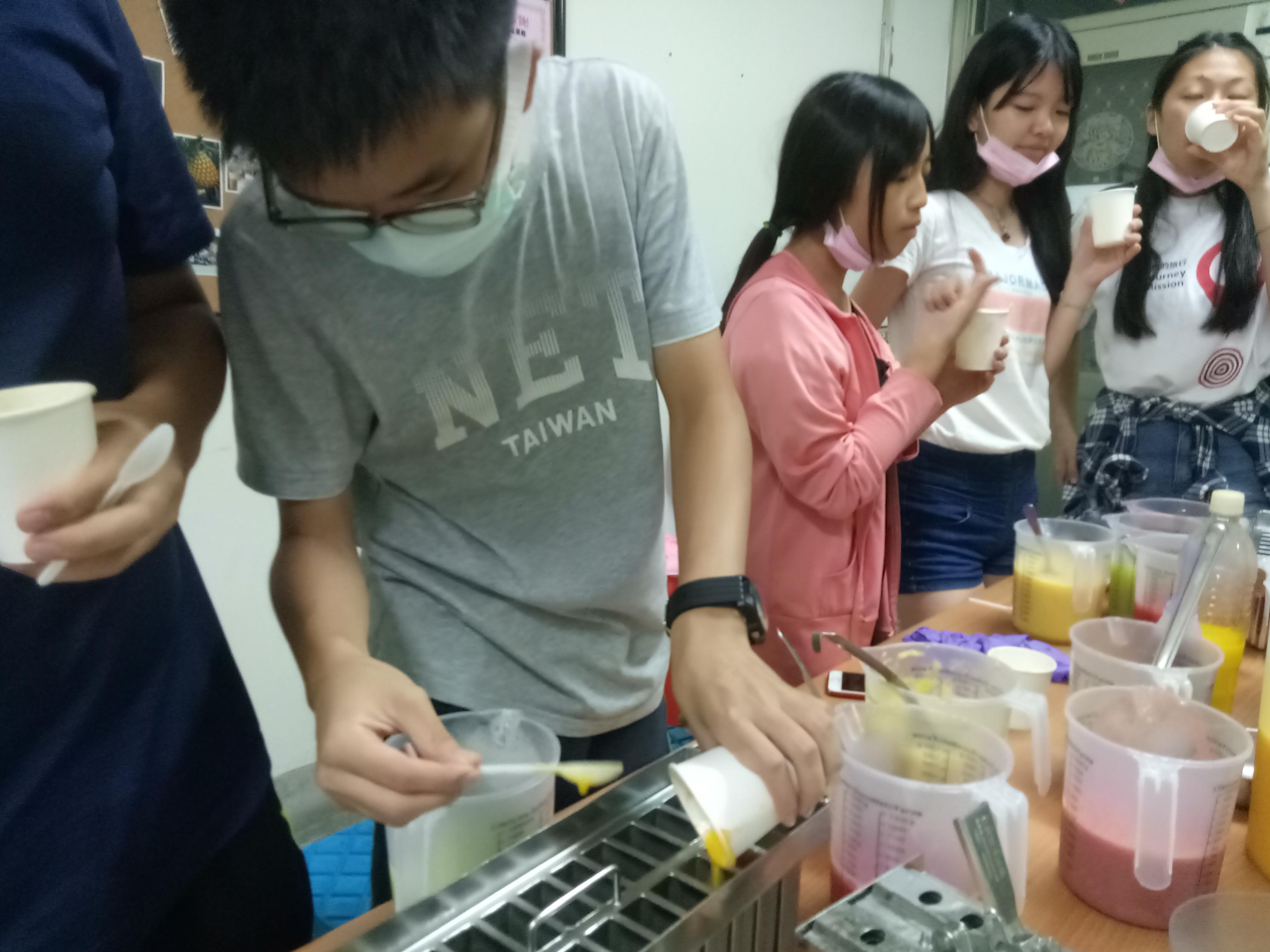 環島旅行高中生 來自桃園高中、武陵高中的李子揚、簡翊庭、陳睿妤、郭霆曜、台中市大里區立人高中林均柔、詹涵亘、張靜柔、游智凱等人一連3天參加回鄉米農場食農教育體驗營。環島旅行高中生 調配研發冰棒口味