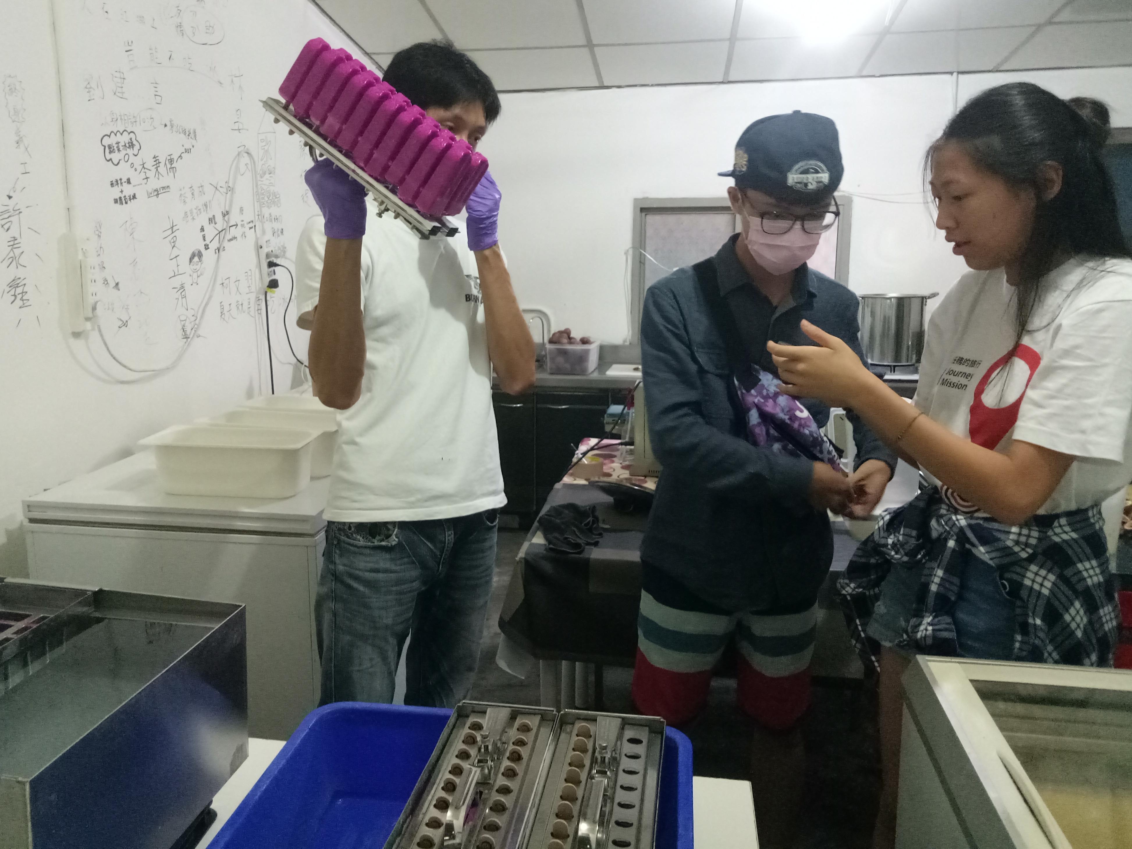 立人高中生張靜柔:唯果粒冰棒做冰棒,從切、挖百香果再到自己手做冰棒的過程都是自己完成的,我原本以為做冰棒是一件很簡單的過程,都不知道其實當中有很多的步驟,要調水果的比例、水果要怎麼搭配才會好吃,冰棒所以具有綿密的口感,除了 要使用品質優良的材料外,更著重在材料間相立的比例關係上。