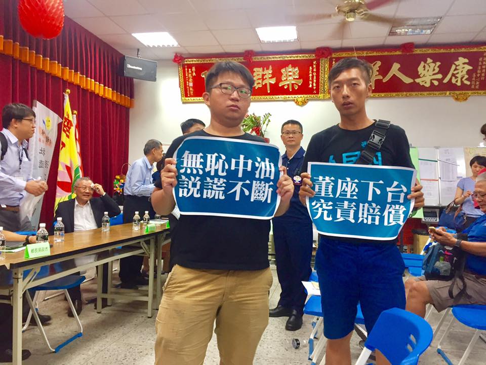 漏油事件再開說明會 西溪青年賴立凱高舉摻油水瓶要求中油董座戴謙下台負責