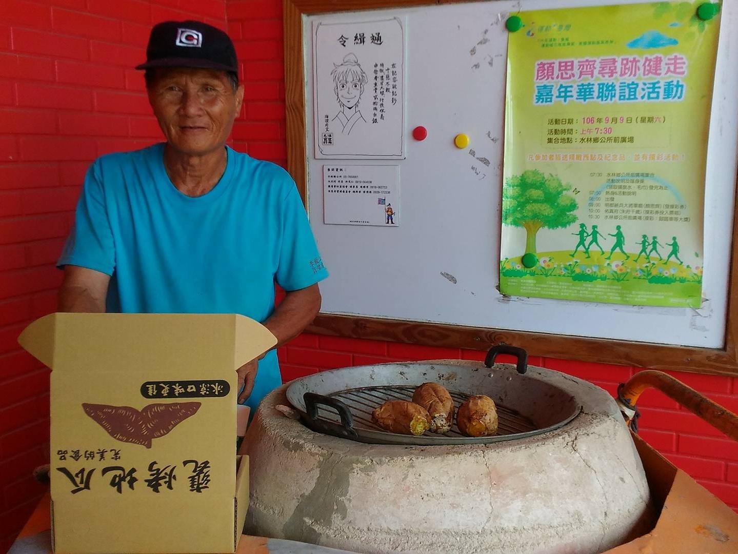 <蕃薯王>王添丁先生,現場烘烤好吃的水林蕃薯宴客。玉記麵包店-鄭旭昇業者提供蕃薯製成大的餐點