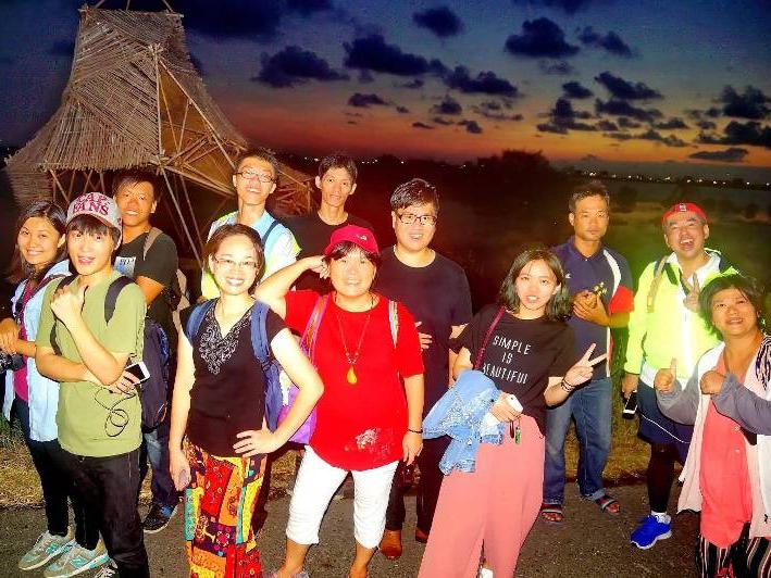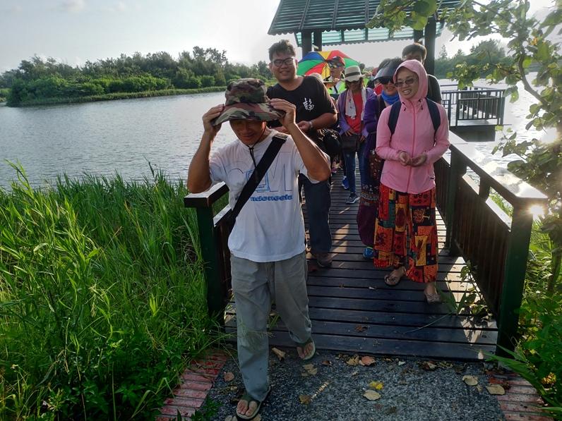 一群公民記者跟著中間黑衣服的黃昱震探索滯洪池黃昱震帶領大家探索,等待正名的口湖鄉滯洪池