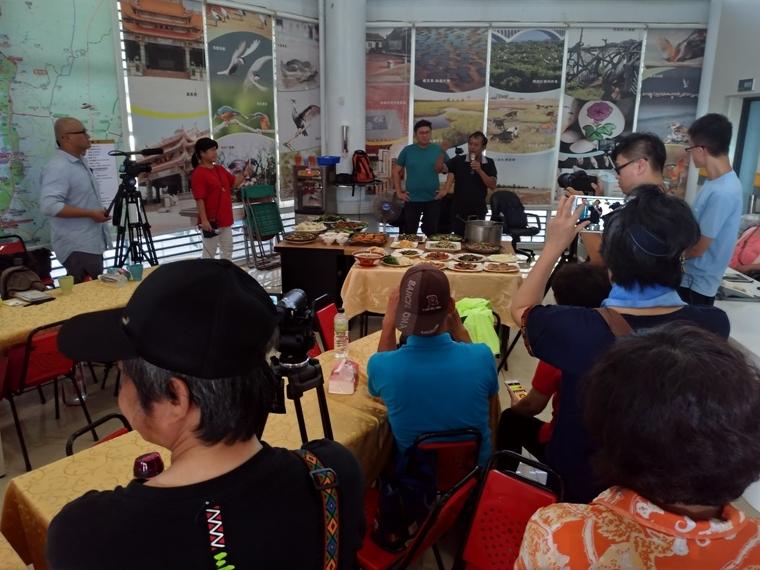 2017.07.28今天在口湖遊客中心,主要是由口湖當地達人攝影家黃昱震,分享他參與主導的守護地方,抗議火葬場設立的整個過程與他的攝影作品,分享結束後,上菜了,擺了滿滿葷素兩桌超吸睛的風味餐,大家圍繞著風味餐不停的打轉拍照,等待著新聞處長張凱傑與口湖鄉公所機要秘書蔡春常到來,兩位致詞完畢後,大家愉快的享用這難得的風味大餐,餐後社區媽媽們還很貼心的拿出年年有魚DIY鑰匙圈,讓大家做好了就可帶回家;吃飽走路最適合了,由地主達人黃昱震帶大家前往探索祕境滞洪池。 -