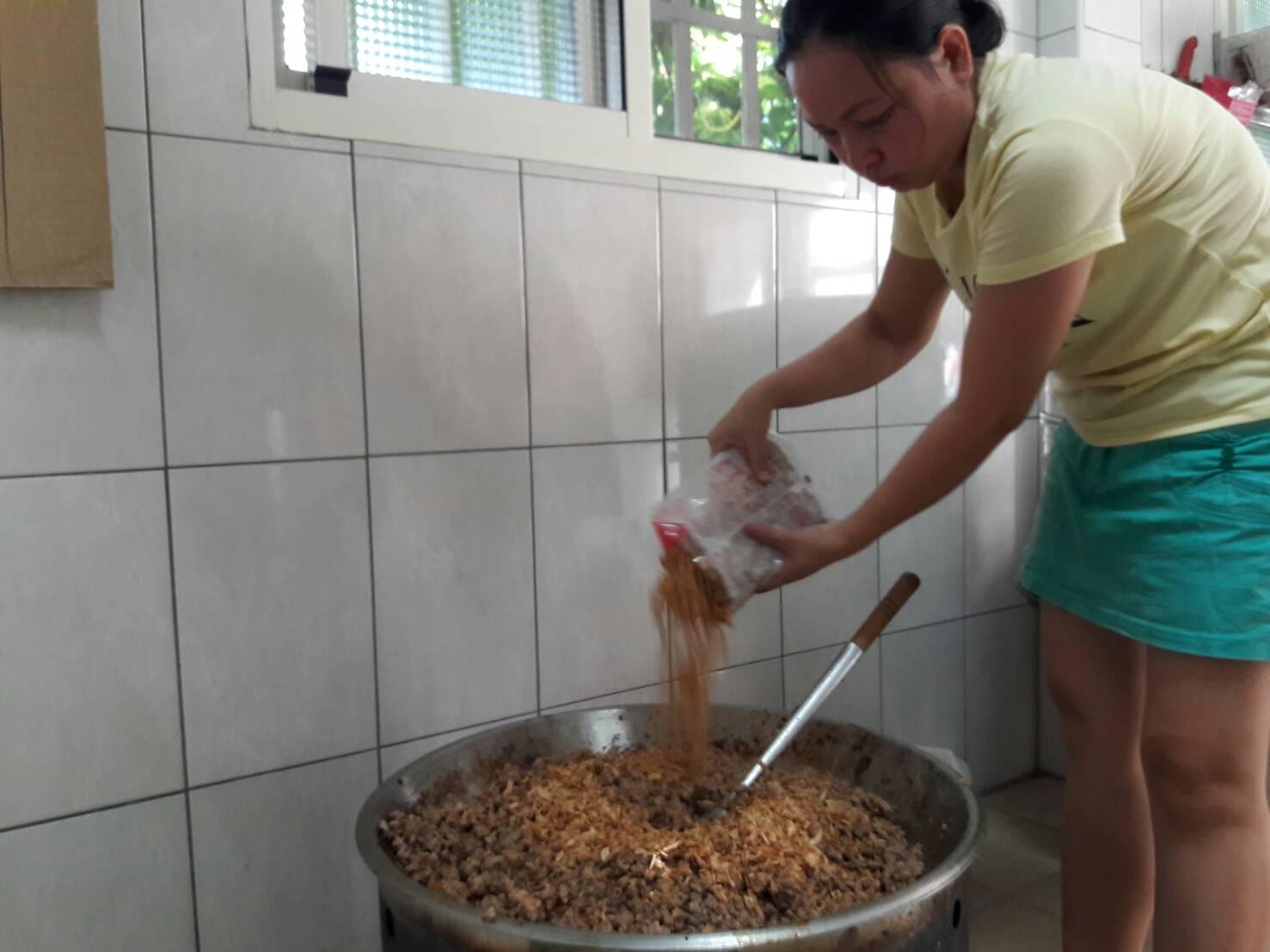 黎秋月女士正在準備碗粿餡料,一大鍋的肉燥香氣十足。新住民黎秋娥女士擁有台灣媳婦勤儉持家、刻骨耐勞的精神。為了堅持古法,每天凌晨3點就跟著丈夫做碗粿,從磨米、煮熱水、糊化、下餡料、添米漿到蒸煮,趕在五點前讓當地早起的客人享受最新鮮的碗粿。 -