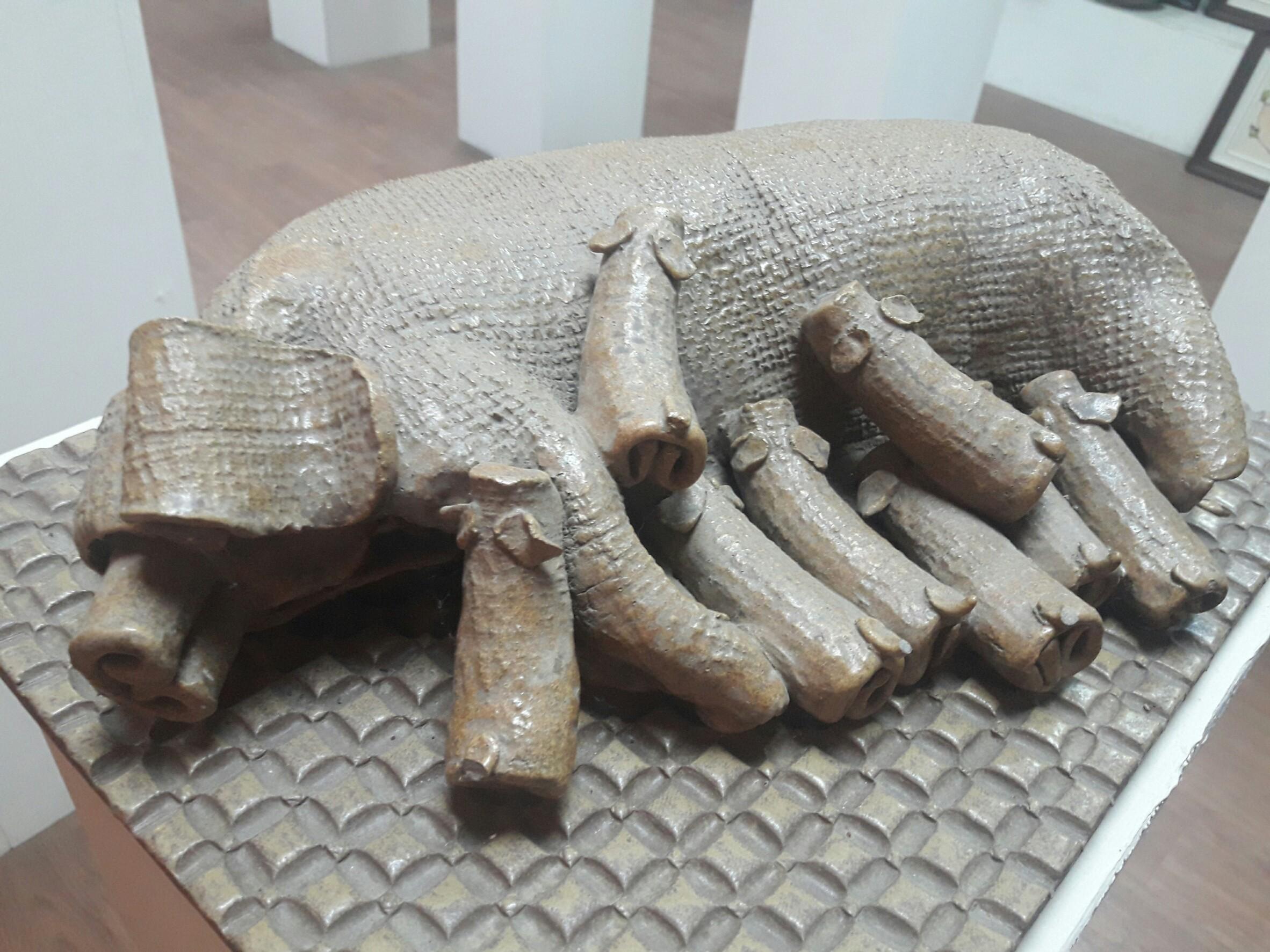 餐後帶公民記者參觀的作品,解說陶版畫、柴燒、電燒、瓦斯燒再次驚豔,看到廚師華麗轉身成為陶藝家,透過解說作品呈現、得獎,對眼前這位藝術家另眼相看。不禁好奇原來一生熱愛藝術專研茶道藝術,陶土創作的藝術家曾經是虎尾農工,虎科大及機關團體的陶藝指導老師,從簡歷中發現還是畢業於政治作戰學校。