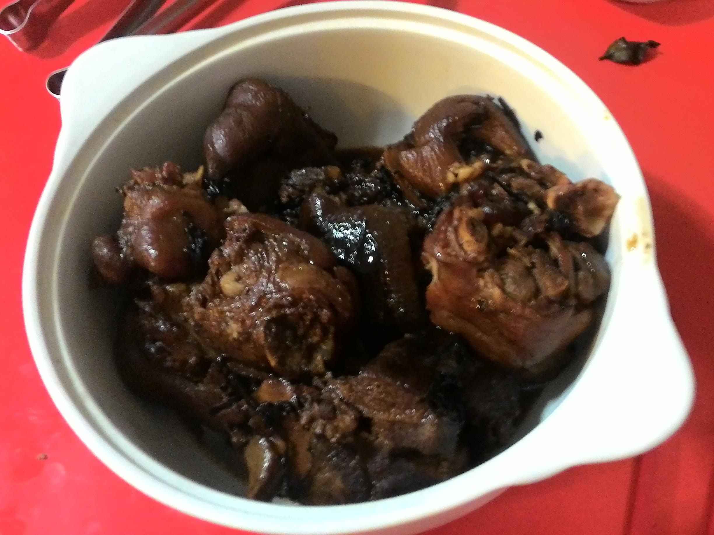 3.加水八分滿,冰糖與普洱茶燉煮,燉煮當中須經常攪拌,使豬腳保持色澤均勻,直到軟爛。