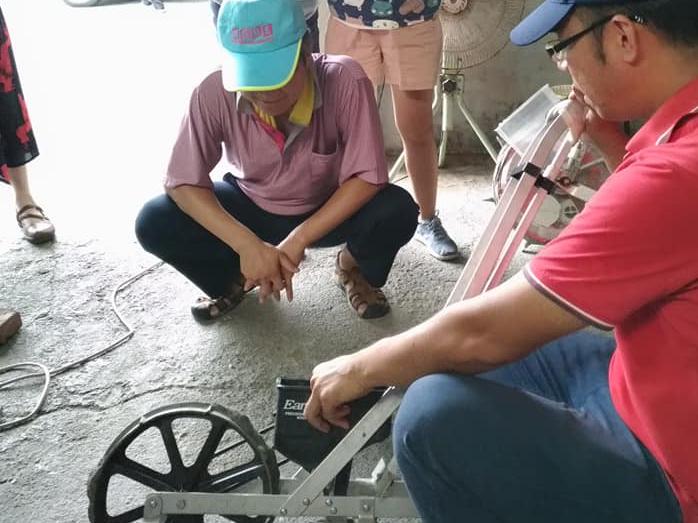 參與民眾聽陳光鏡(右)解說播種機分享自然農法在台灣萌芽的希望