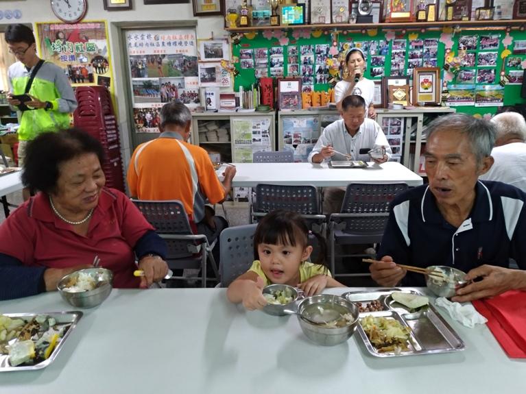 埒內長春食堂一星期供應五天的午餐,阿公阿嬤帶著小孫女愉快的在這裡用餐,不用自己辛苦煮飯,還可以跟大家在這裡愉快的一起聊天,一起吃飯,一邊用餐一邊還可以欣賞美麗的歌聲,也可以自己上場高歌一曲,自娛娛人,多多與人交流,身心會比較快樂比較健康,家裡老的小的在社區大家彼此照應,年輕人也可以比較安心的工作。