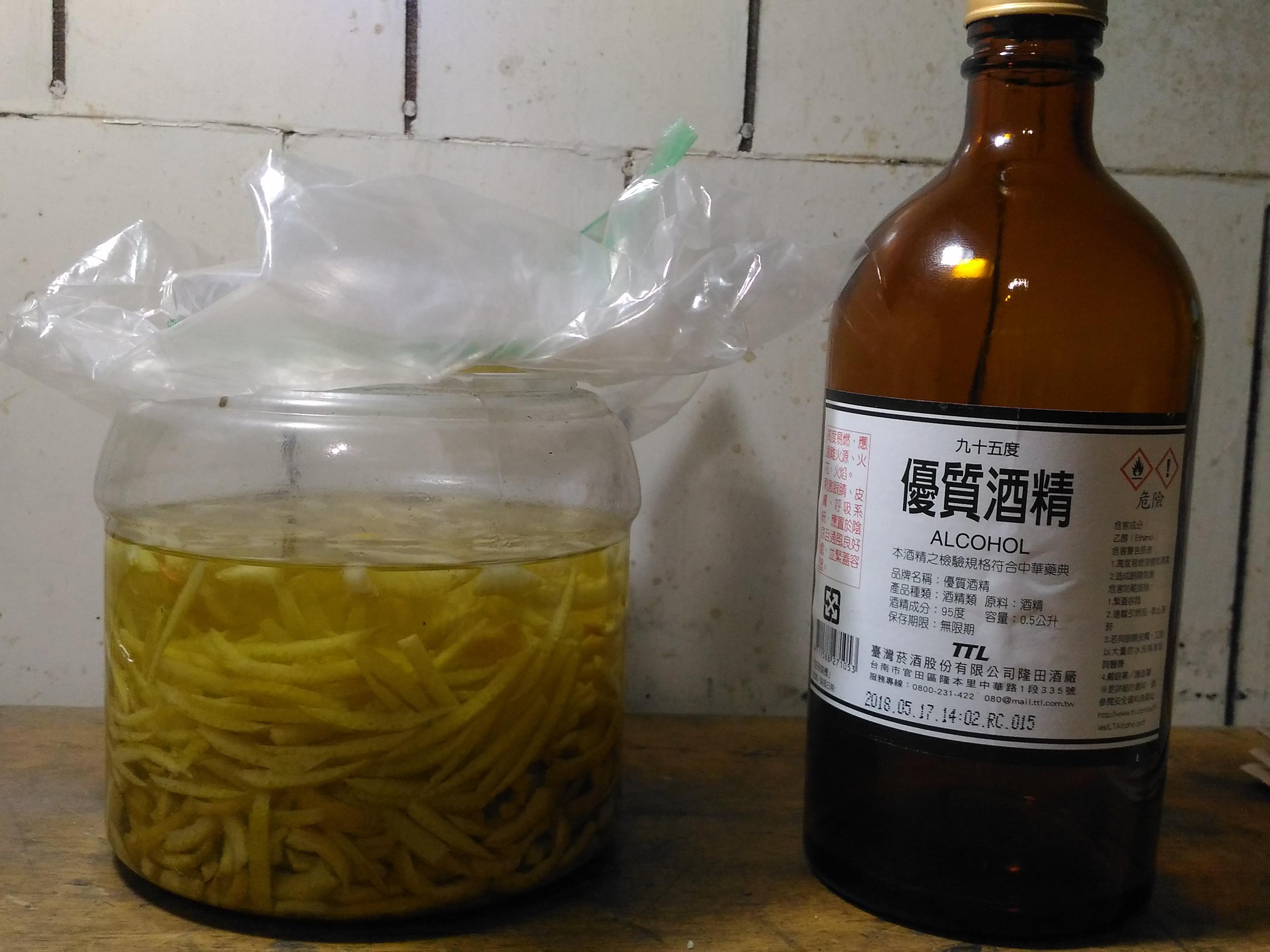 柚仔清潔劑作法很簡單,75%以上的酒精,量要淹過皮喔。柚仔皮切小塊點,不切也行,只是粹取較不完全,或更久的時間。時間約7~15天,瀘出酒精裝瓶,柚子皮裝袋可直接拿來去油膩,但是不起泡。