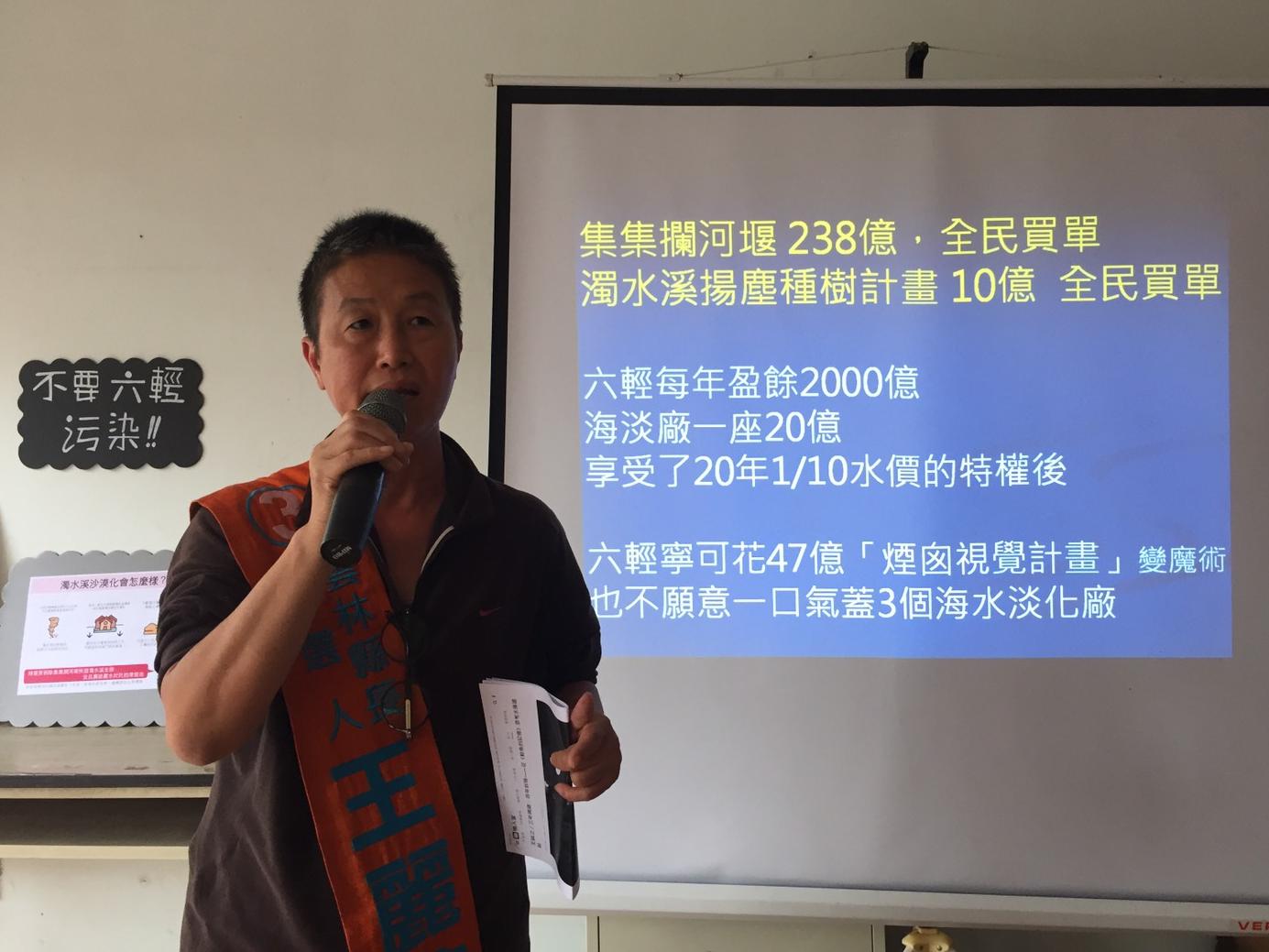 王麗萍強調國民黨政府花了公帑238位蓋錯誤的集集攔河堰,75%的水源提供給六輕使用,而六輕的用水費卻只有一般用水費的十分之一,六輕當年承諾用水要自足,蓋一個海水淡化廠不過20億元,但是直到今日六輕卻始終不願實現100%用水自給的承諾,造成濁水溪流域從生態、產業、地景、用水全面性的問題,是可忍俗不可忍,她強調上任後一定立即成立拆除集集攔河堰專案小組,集合社會力量,要求六輕用水自給自足,讓濁水溪重新奔流,讓台灣的母親河恢復生機。