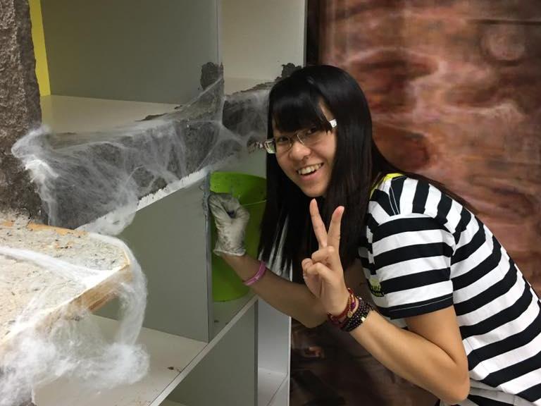 青年志工利用暑假期間,到志工中心擔任小天使,也趁機體驗密室的製作,將原本的木頭櫥櫃,塗上紙漿,營造“仿舊感”、“穿越風”。 -