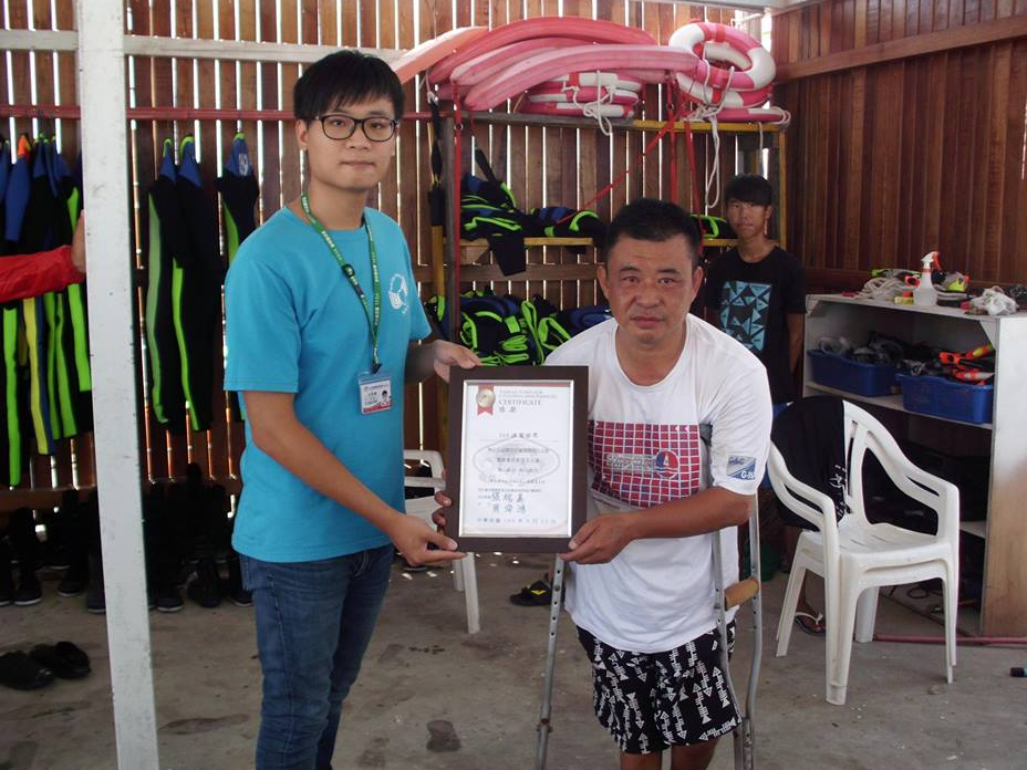 林育地(右)讓家扶的孩子完成了浮潛的夢,接受家扶贈送的感謝狀。