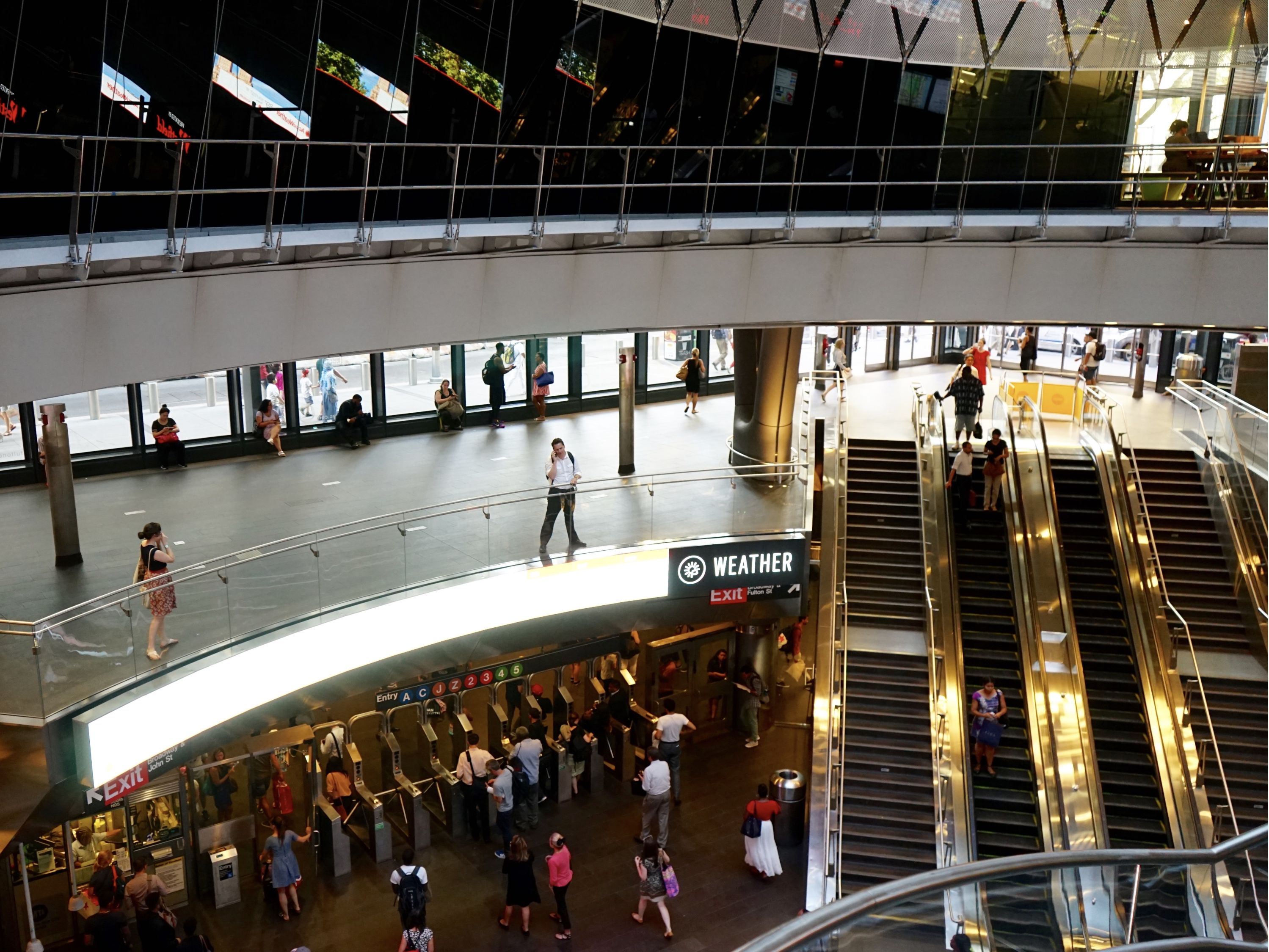 當地民眾或是觀光客可以從Broadway和Fulton Street的Fulton Center地鐵轉運站(本身也是一座商場和辦公空間)經由新建地下通道走到WTC4和Oculus,再同樣經由地下道走到Hudson River畔的Brookfield Place,完全不需要走到戶外。