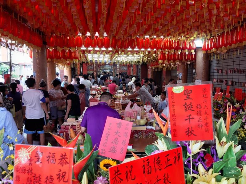 斗六福德宮中秋節舉行盛大祭典活動斗六福德宮在中秋節舉行盛大祭祀活動,各界供奉的鮮花擺滿每個角落。