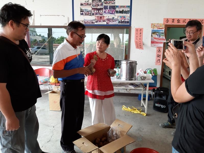 斗南田頭里長(左2)向公民記者朋友介紹馬鈴薯馬鈴薯是我們日常接觸到,非常普遍的食材,卻不一定知道台灣的主要產地就在雲林斗南,它的種植是在第二期稻作收割後,到明年第一期稻作插秧前收成,大約3 - 4個月的時間,馬鈴薯未成熟的與發芽的都不能吃,把發芽的芽眼,採塊狀切割下來就能種植,所以一根馬鈴薯可以切成好幾塊來栽植,日常保存馬鈴薯的方式就是削皮→汆燙(可切片)→冷凍,這樣可以放很久不會壞,
