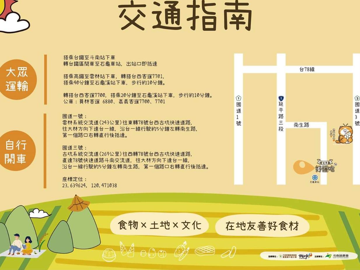 雙十國慶連假四天的市集活動於10月10日(四)至13日(日)舉辦,斗南鎮石龜火車站旁,可搭乘火車前往,自行前往可由國道一號接台78線斗南出口下交流道,前往嘉義方向走,延台一線斗南鎮延平路三段左轉南生路,第一個路口右邊前進200公尺處抵達。
