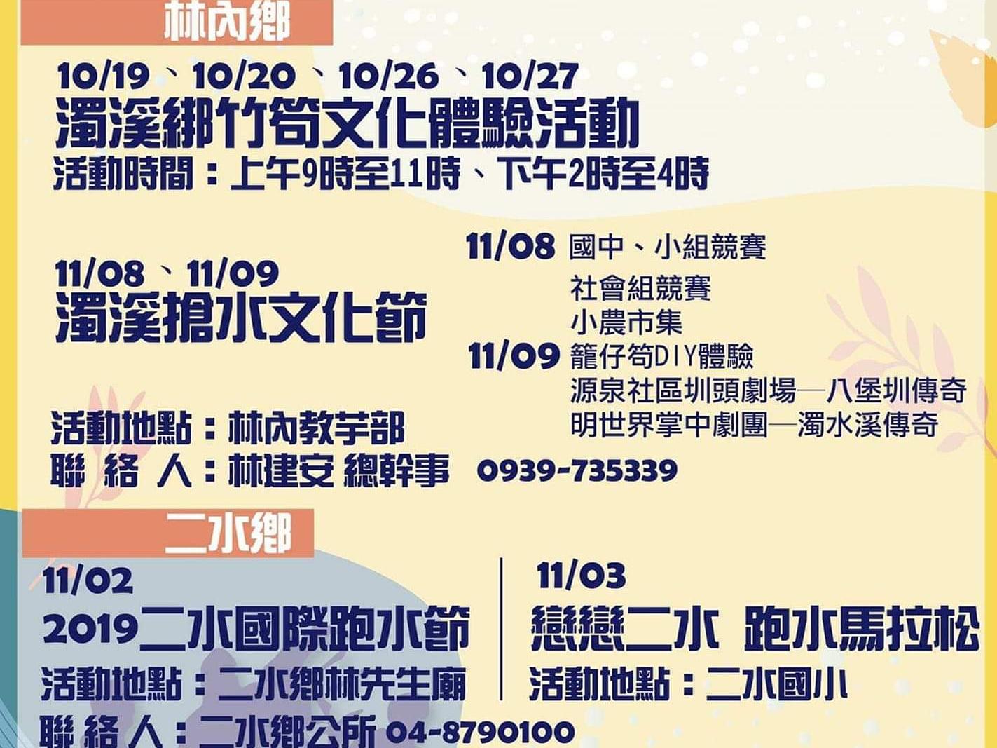 濁溪搶水文化節正式賽事將在11/8及11/9舉辦,11/8由國中、小組別開啟,透過學校共同參與,讓文化在地扎根,11/9則是由社會組賽事登場,邀請有興趣的民眾能夠前往報名參加,最高獎金還有6000元能夠抱回家,當天還有優質的小農市集,邀請在地農友共同擺攤展售,還有限量的籠仔笱DIY活動提供報名,並且邀請二水鄉源泉社區圳頭劇場及明世界掌中劇團透過戲劇及布袋戲來演出八堡圳的文化故事,活動豐富精彩可期。