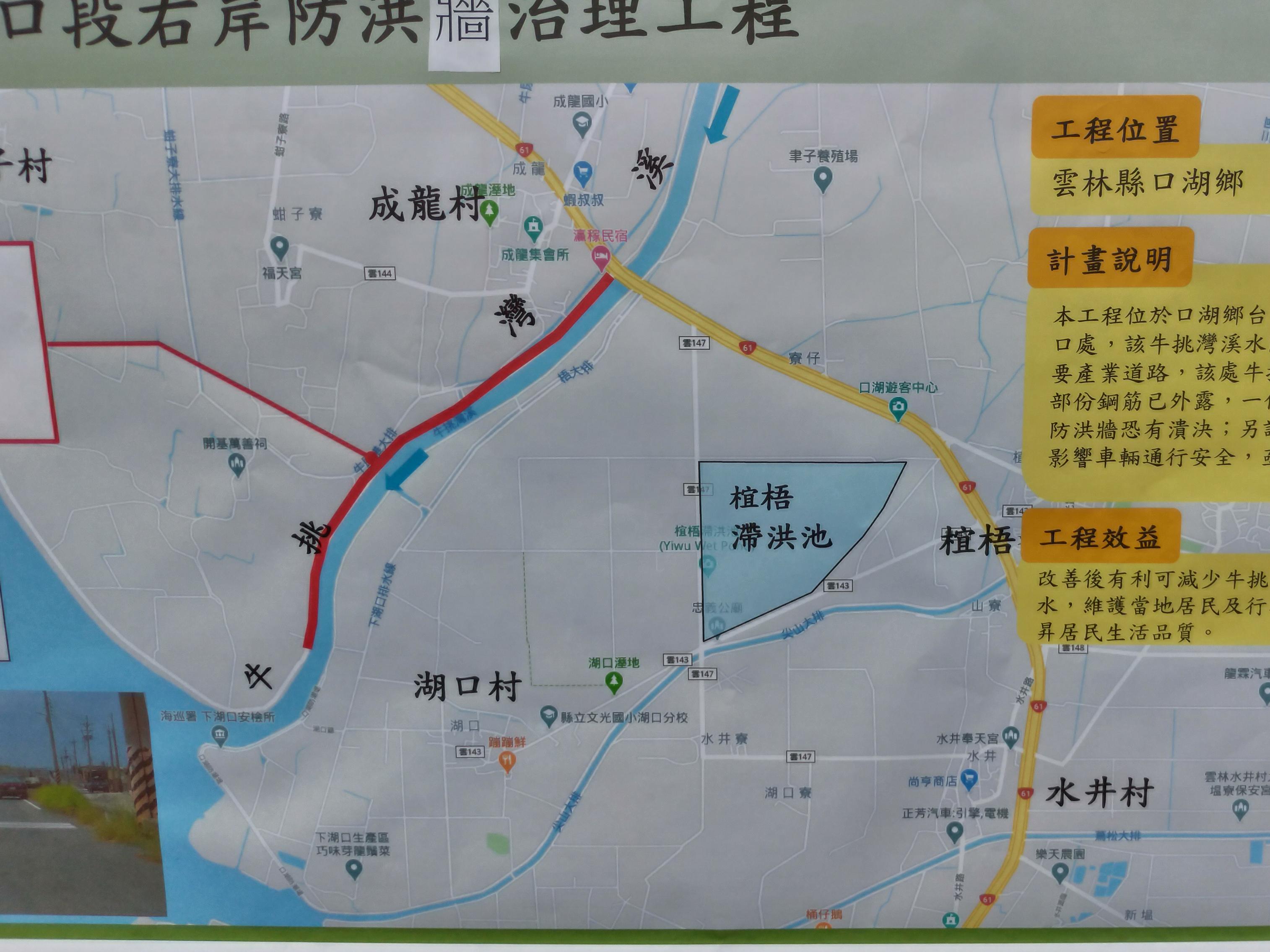 這次水利署長賴建信立委蘇治芬,為口湖鄉民代來了1.5億的治水經費,牛挑灣溪良心橋左岸防洪牆治理工程,總工程費用5300萬,牛挑灣溪右岸防洪牆治理工程,總工程費4100萬,宜梧北村中排護岸改善工程,總工程費5360萬,改善宜梧地區排水,修建牛條灣溪兩岸的防洪牆整修路面,讓牛挑灣溪兩岸的鄉民免於水患的恐懼,防洪牆保護了老百姓的身家財產性命的安全,路面整修還給鄉民一條安全回家的路公德無量。