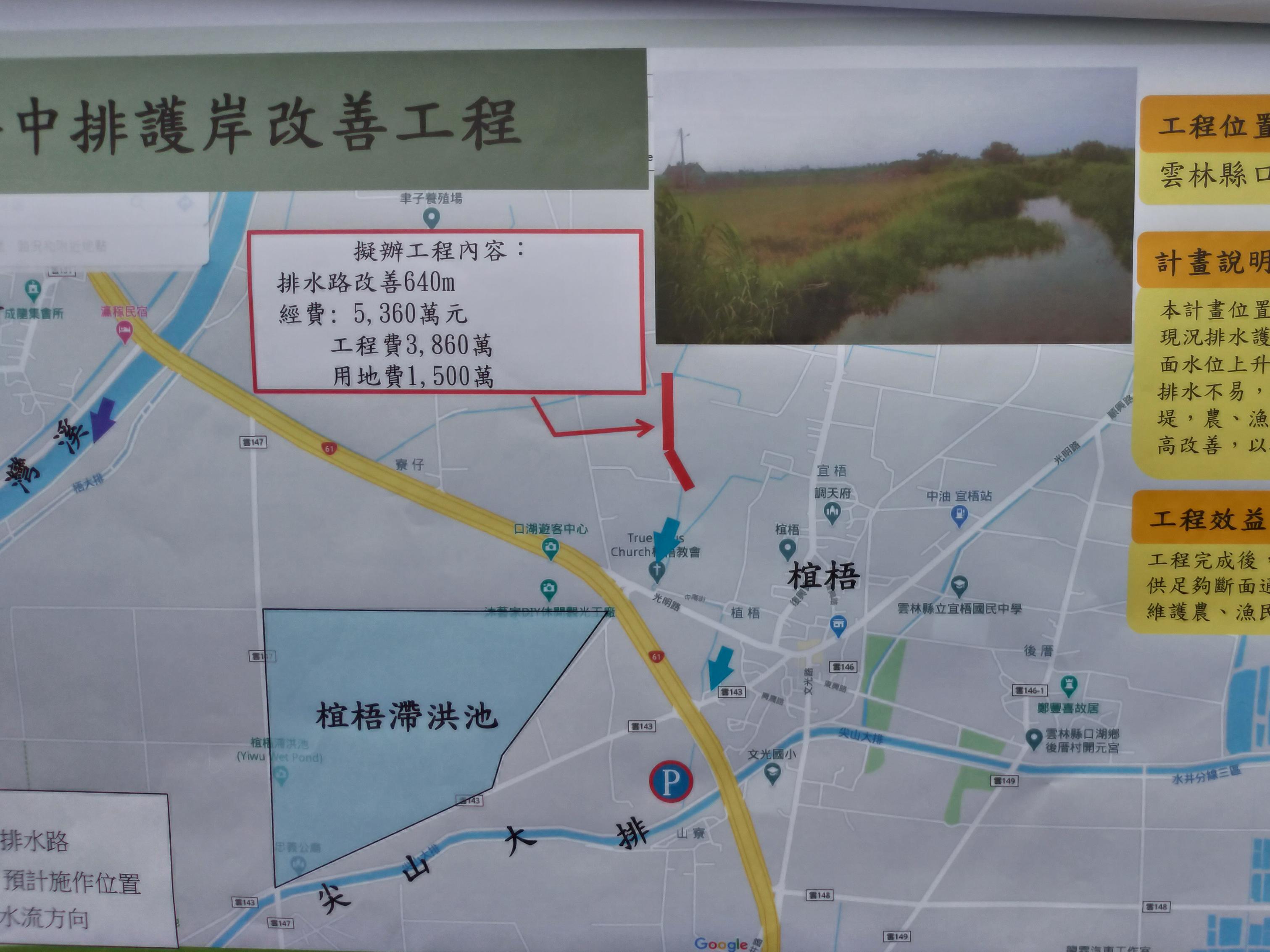 在口湖鄉梧北村會勘時,蘇治芬說因為地層下陷及溫室效應海水水位上升,椬梧中排在颱風季常有溢堤的狀況出現,排水路與堤防改建後,梧北村鄰近魚塭淹水就能有效改善,維護農、漁民生命財產安全。賴建信署長補充,椬梧中排是口湖鄉重要水利工程,施作經費約5360萬,建議縣府盡速辦理用地取得作業。