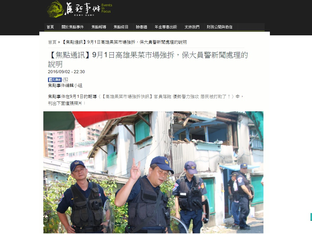 焦點事件在9月1日的報導〈【高雄果菜市場強拆快訊】官員落跑 優勢警力強攻 居民被打敗了!〉中,刊出下面這張照片: