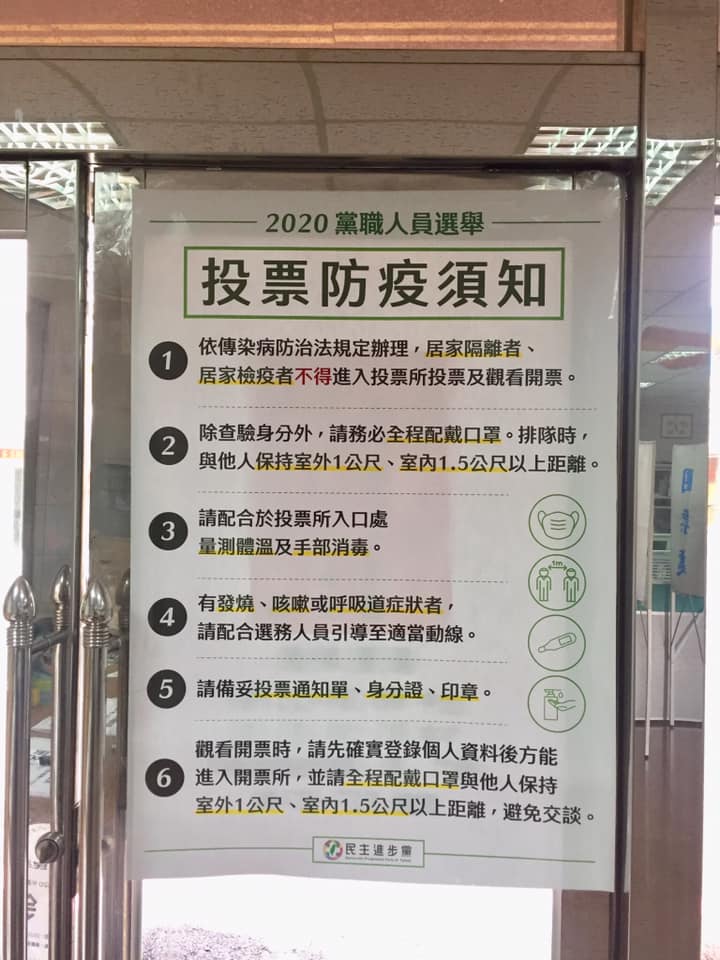 民進黨全國各縣市黨部主委24日同步進行改選,因受武漢肺炎(新冠病毒)疫情影響,中央黨部令全國地方黨部配合疫情指揮中心防疫政策,要求全體黨員及選務工作人員全程務必配戴口罩、配合投票所入口體溫檢測及手部消毒及遵守排隊投票時請與他人保持室外 1 公尺、室內 1.5 公尺以上社交距離規範。