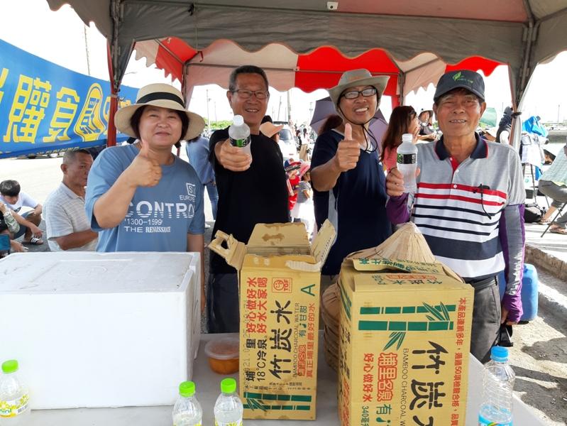 四湖鄉萡子寮社區理事長蔡心娜(左1)執行長蔡茂昌(左2)村長蔡水龍(右1)特地帶領箔子寮社區聯合服務團隊免費提供物資給遊客使用為了來自各地的遊客,四湖鄉萡子寮社區理事長蔡心娜與執行長蔡茂昌還特地帶領萡子寮社區聯合服務團隊,在港口內當天中午1點至3點免費提供結冰水和在地自製特色粉粿冰(給小朋友準備的是枝阿冰)與斗笠等物品給外地遊客使用,讓人揪感心,也讓外地遊客感受到雲林人的溫暖與大器。