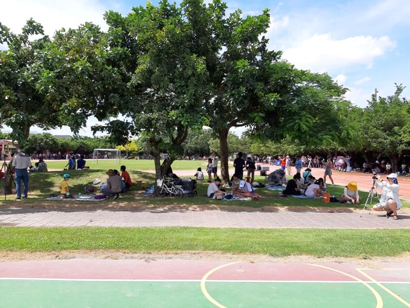 雲林縣日環食活動會場【水燦林國小】操場四周樹蔭下全是前來等待觀賞日環食的民眾同樣位在環食帶上的雲林縣,也是台灣本島最早出現日環食的地方,雲林縣政府在水林鄉水燦林國小辦理「雲遊水林看見日環食活動」,當天贈送每人一張10元美食折價卷,送出100張野餐墊、1000支日環食觀測鏡,辦理天文講座,還安排遊覽車免費供民眾遊覽水林鄉....等等,雖也吸引數千人前往參加,卻不似嘉義受到萬眾矚目。