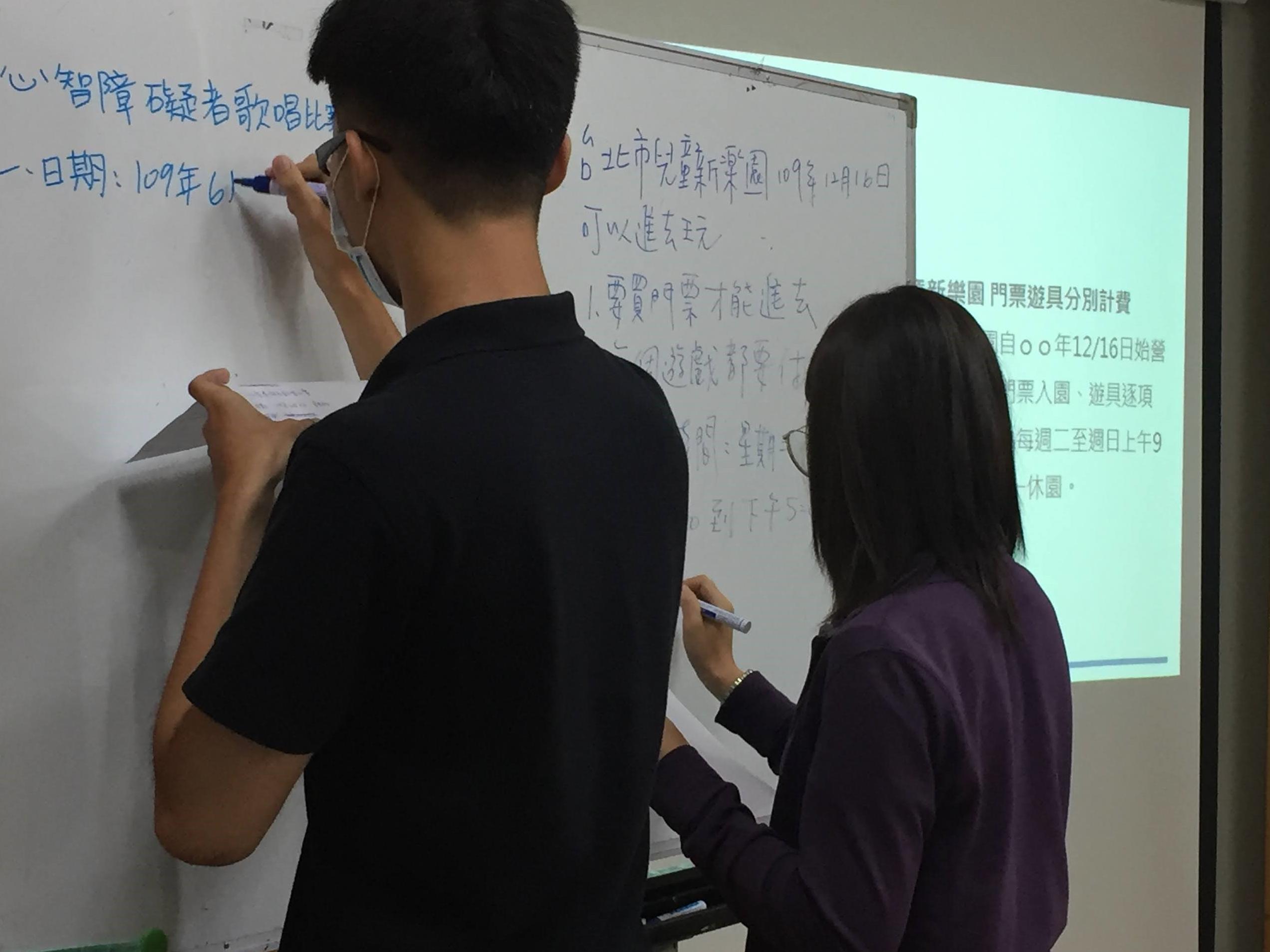 學員們嘗試以易讀概念將原本複雜活動訊息改寫成易讀版雲林縣政府第一次在地舉辦易讀概念課程,縣內身心障礙機構、團體報名參與相當踴躍, 把教室擠的滿滿地,大家不僅只是聽課的學生,更參與討論及嘗試易讀概念實作,並上台分享,課後有學員表示:「上課前以為易讀跟童書差不多,原來天差地別,上完課後會嘗試將易讀應用在工作上,例如,檢視既有教材或文宣等等,希望未來運用易讀思維,幫助更多身障者參與社會」。